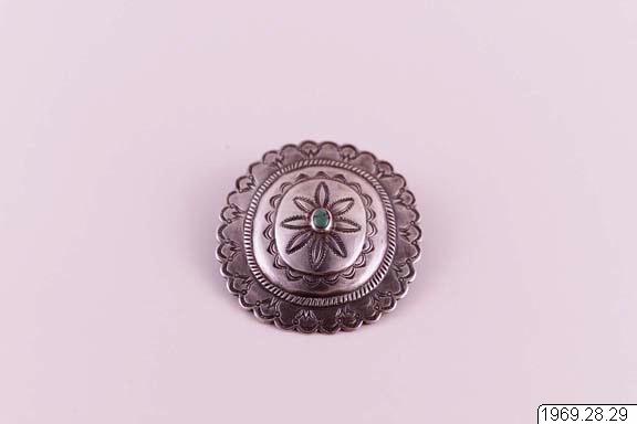 Bältespänne s.k. "concho" av silver. Största diameter: 8,5 cm. Spännet, som är av äldre typ, är bl.a. dekorerat med blomstermotiv med en turkos i mitten. Inköpt hos Desert House Crafts, Tucson, Arizona för 17,50 dollars. Om indianernas silverarbeten i Southwest se allmän orientering i orig.katalogen. litt.: Harry P. mera: Indian Silverwork of the Southwest, Illustrated - Vilume One, Arizona 1960. Insaml., under resa H. Wassén Köp från: Desert House Crafts, Tucson, Arizona Konservering K 83: 30