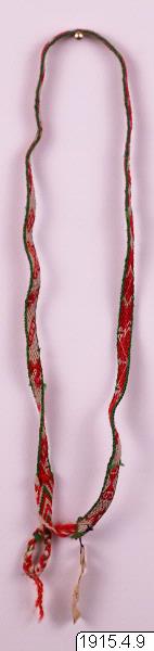 Bredd: 7 mm Teknik: Väv, varpmönstrad Varptäthet: summa ca 30 tr/cm Inslagstäthet: ca 12 tr/cm Varp: grön.................ull....2-tr....S-tv röd.................... " .... " .... " cerise............... " .... " .... " ofärg. vit........... " .... " .... " Inslag: grön............... " .... " .... " Varpen börjar och slutar med öglor Flätor: en tuskaftsfläta övergår till en 3-flätad ögla i ena sidan. Andra sidan vävd ända ut. >