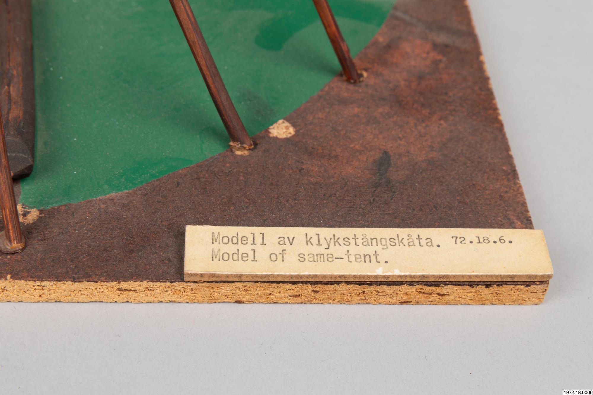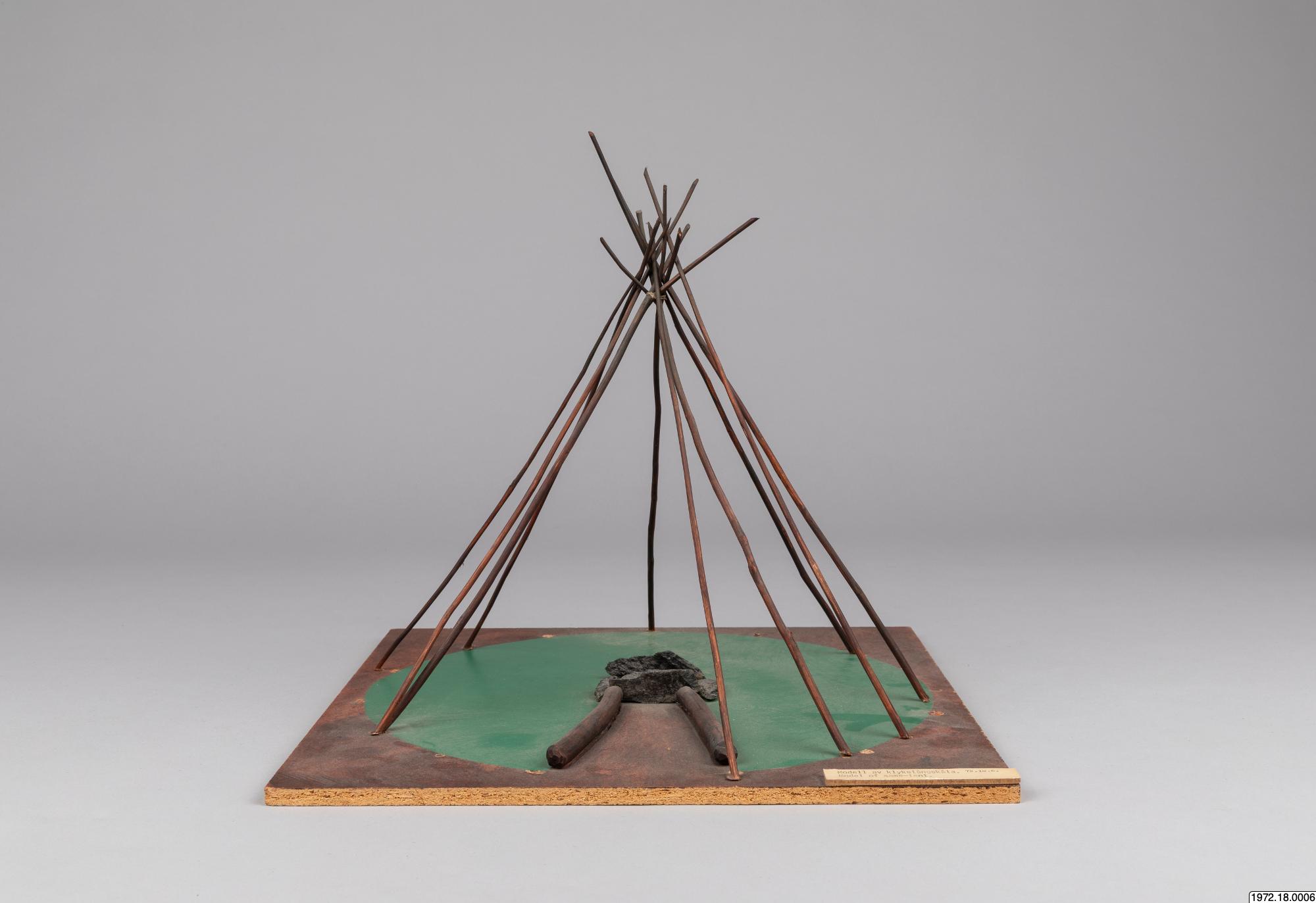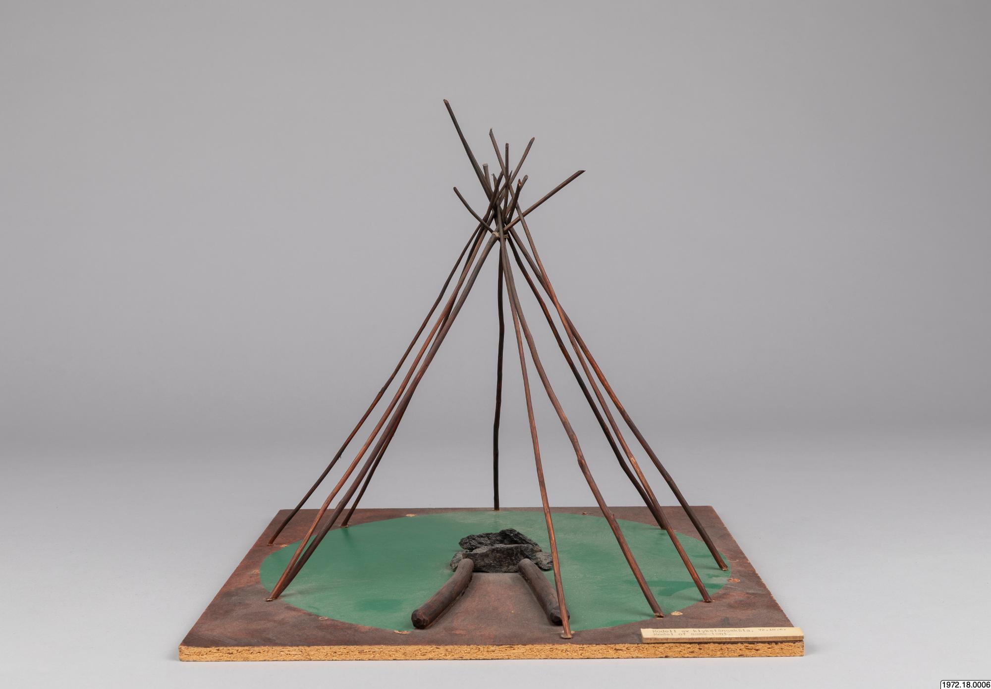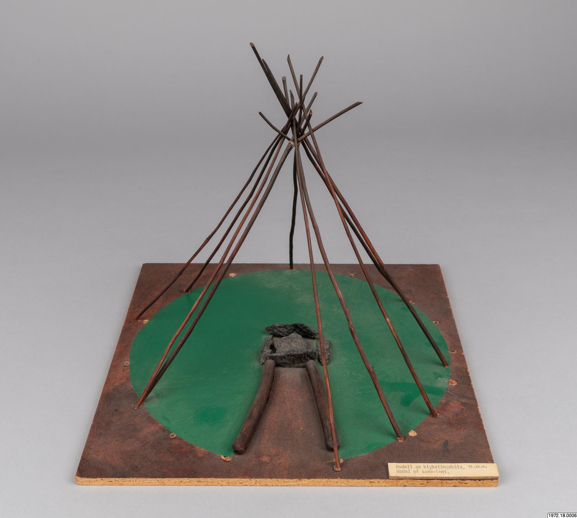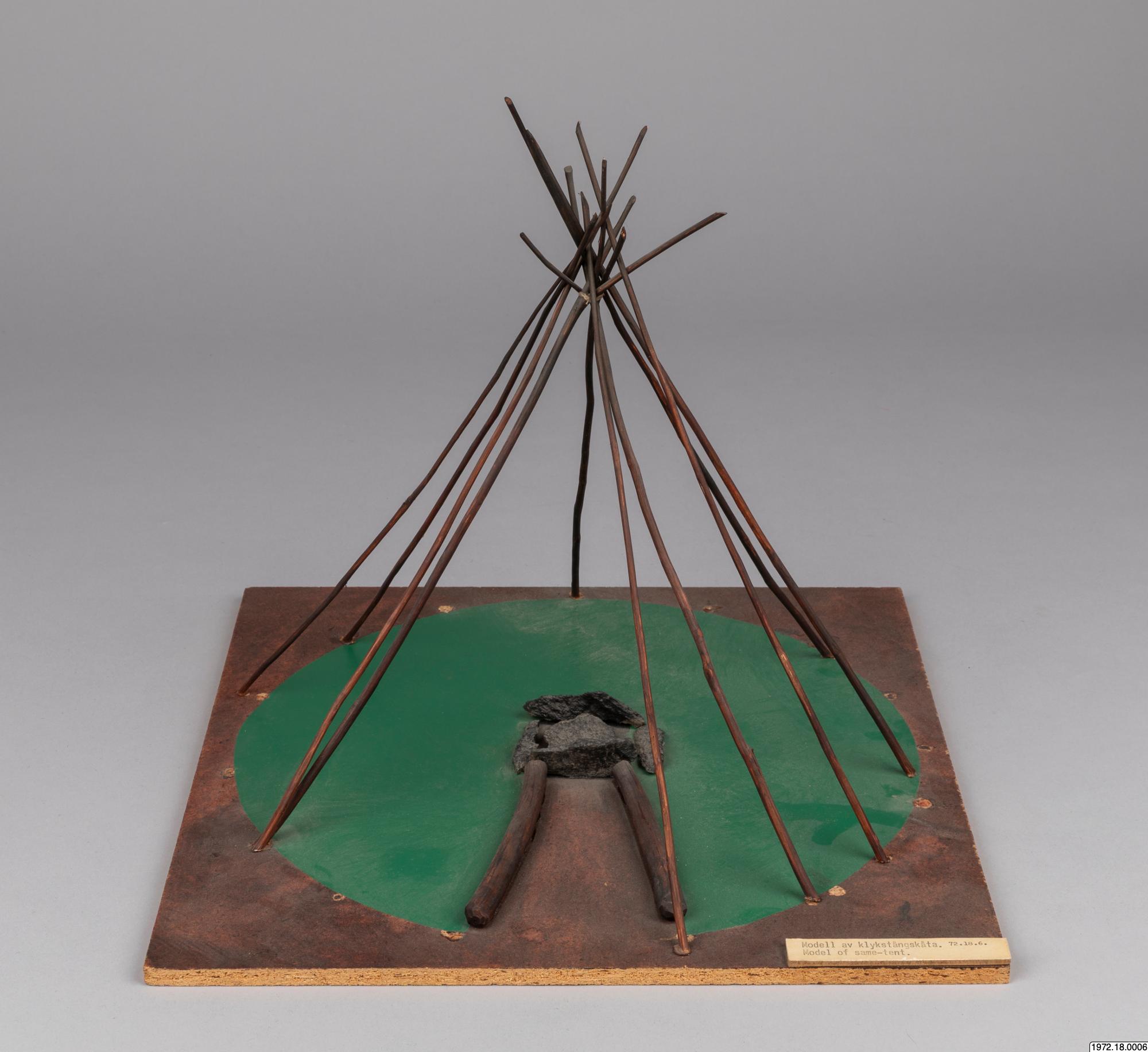 Om klykstångskåtan (1972.18.0006): Kåtan kunde se olika ut och även hållas upp av olika träkonstruktioner. Jämför modellerna 1972.18.0006-10. Relaterade sökningar: Register: [alla] FOLNAM: samer OBJTXT [innehåller]: byggnader kåta (av Madeleine Stirnimann, socialantropolog, VKM Göteborg, 2010)