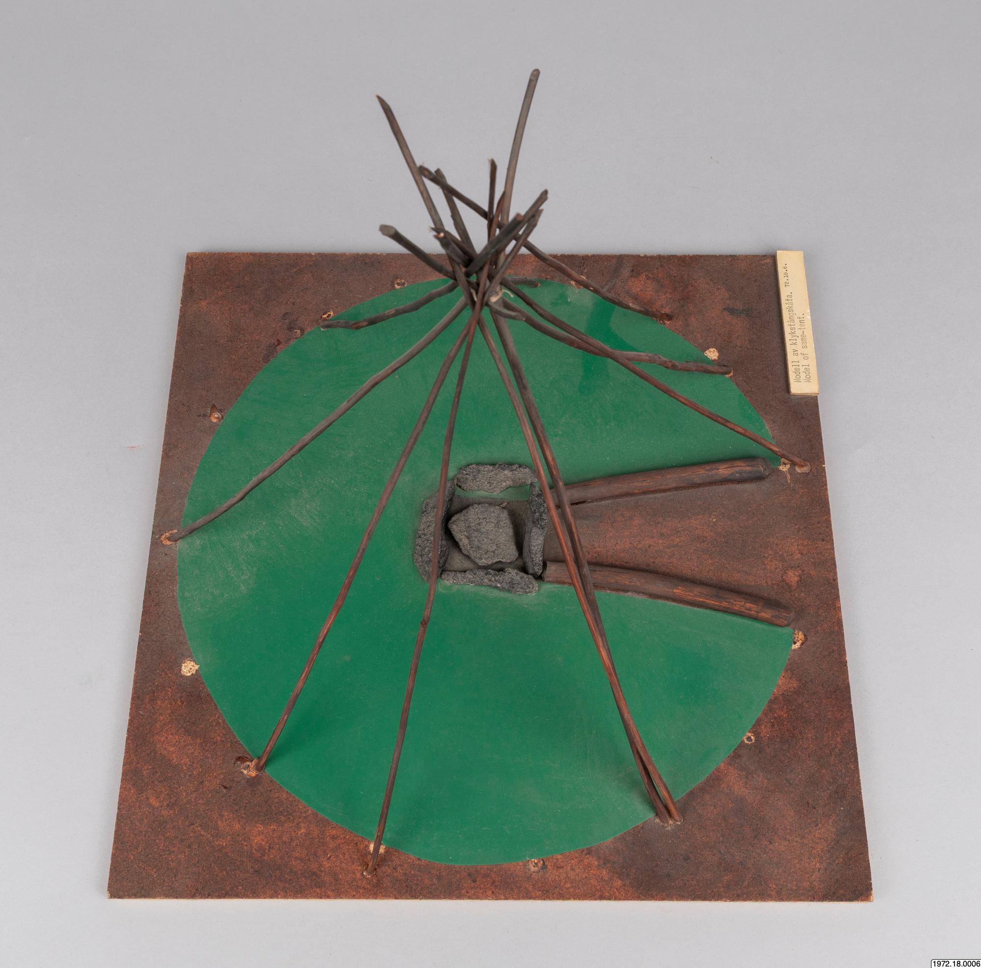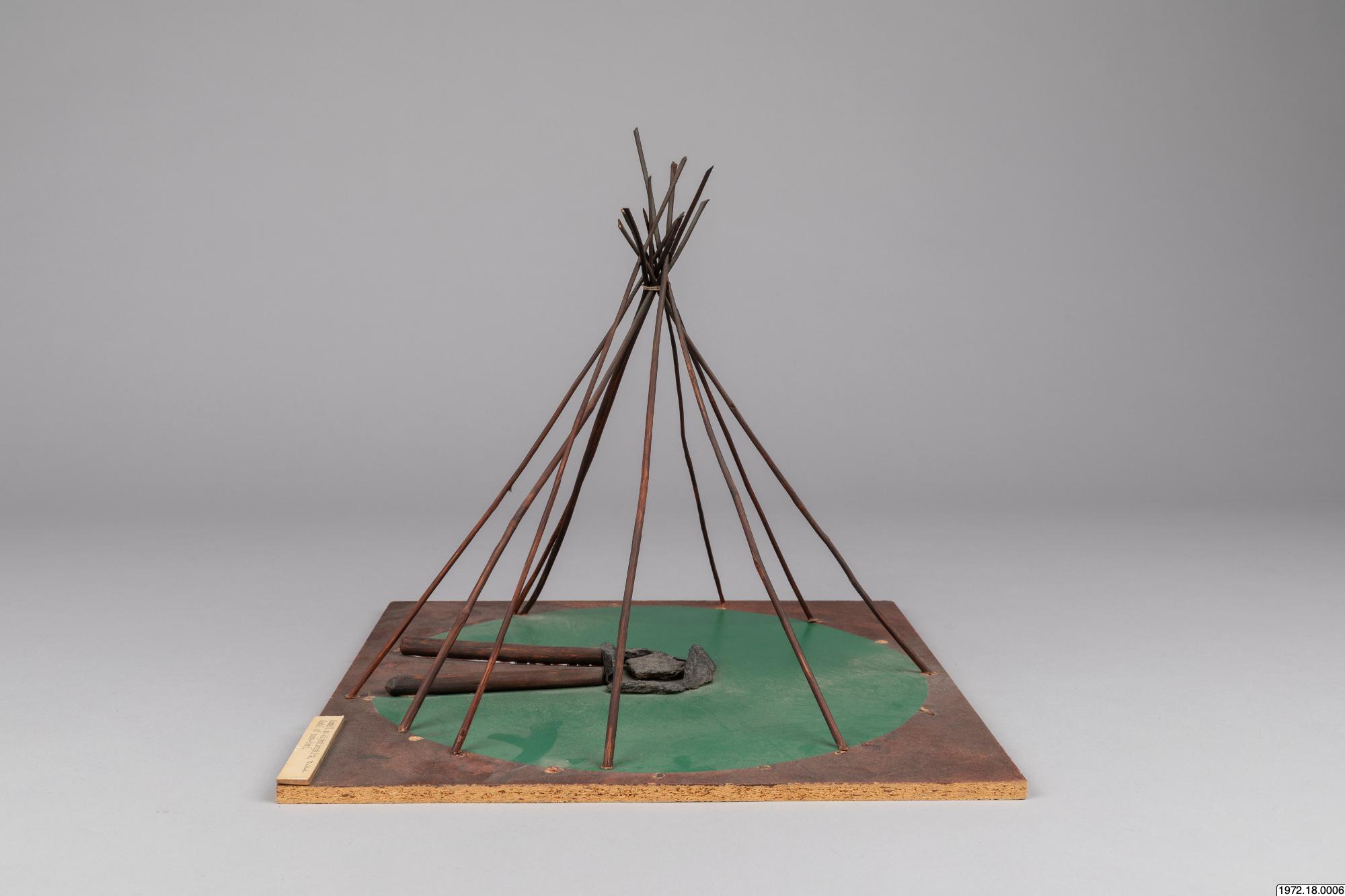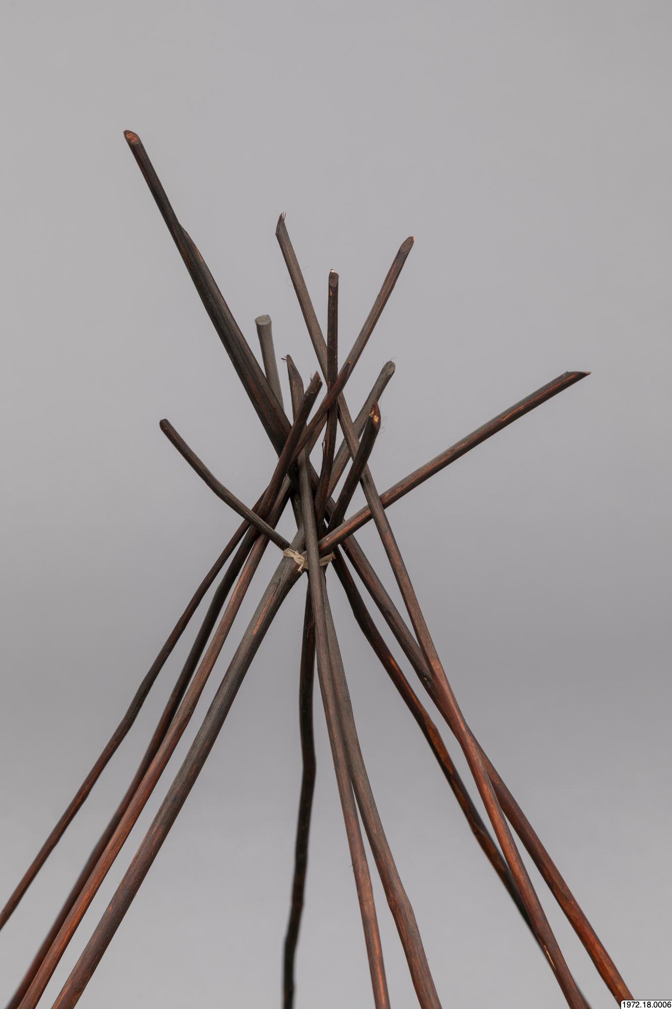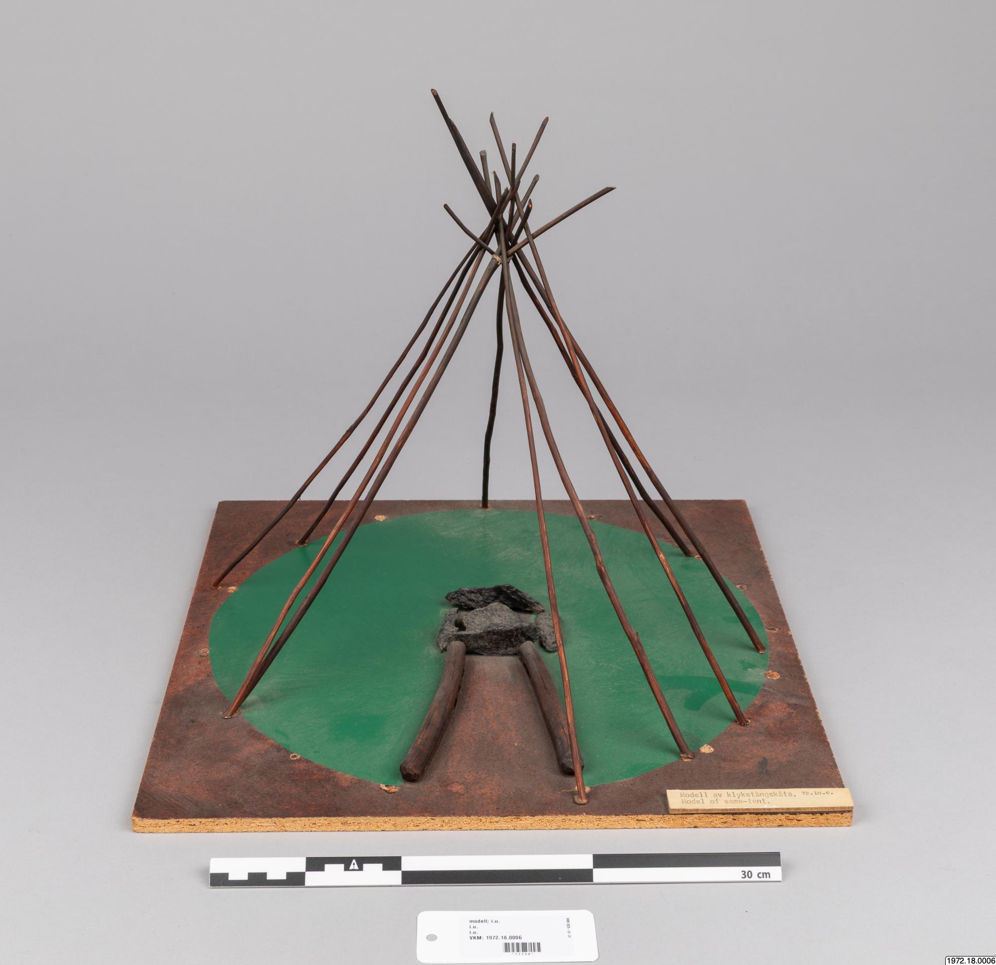 Om klykstångskåtan (1972.18.0006): Kåtan kunde se olika ut och även hållas upp av olika träkonstruktioner. Jämför modellerna 1972.18.0006-10. Relaterade sökningar: Register: [alla] FOLNAM: samer OBJTXT [innehåller]: byggnader kåta (av Madeleine Stirnimann, socialantropolog, VKM Göteborg, 2010)