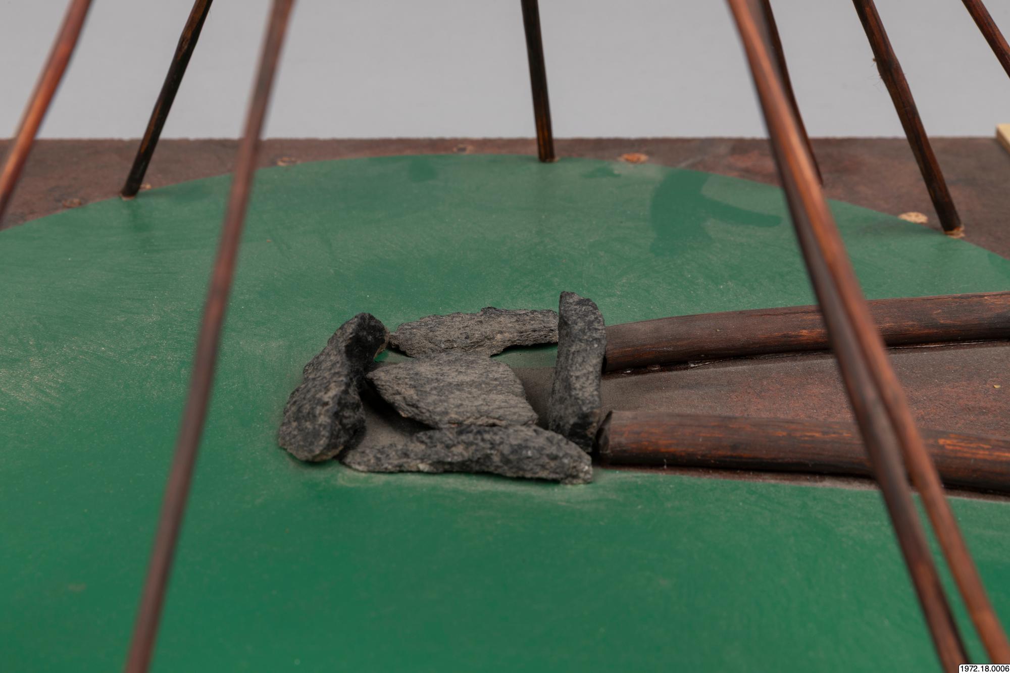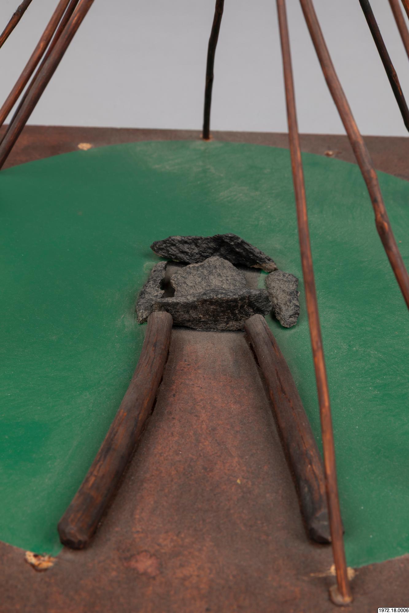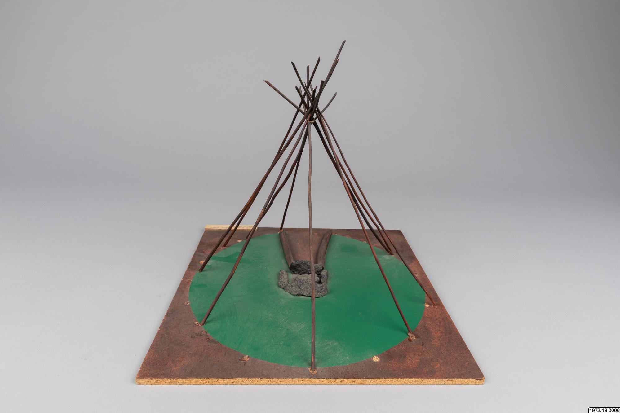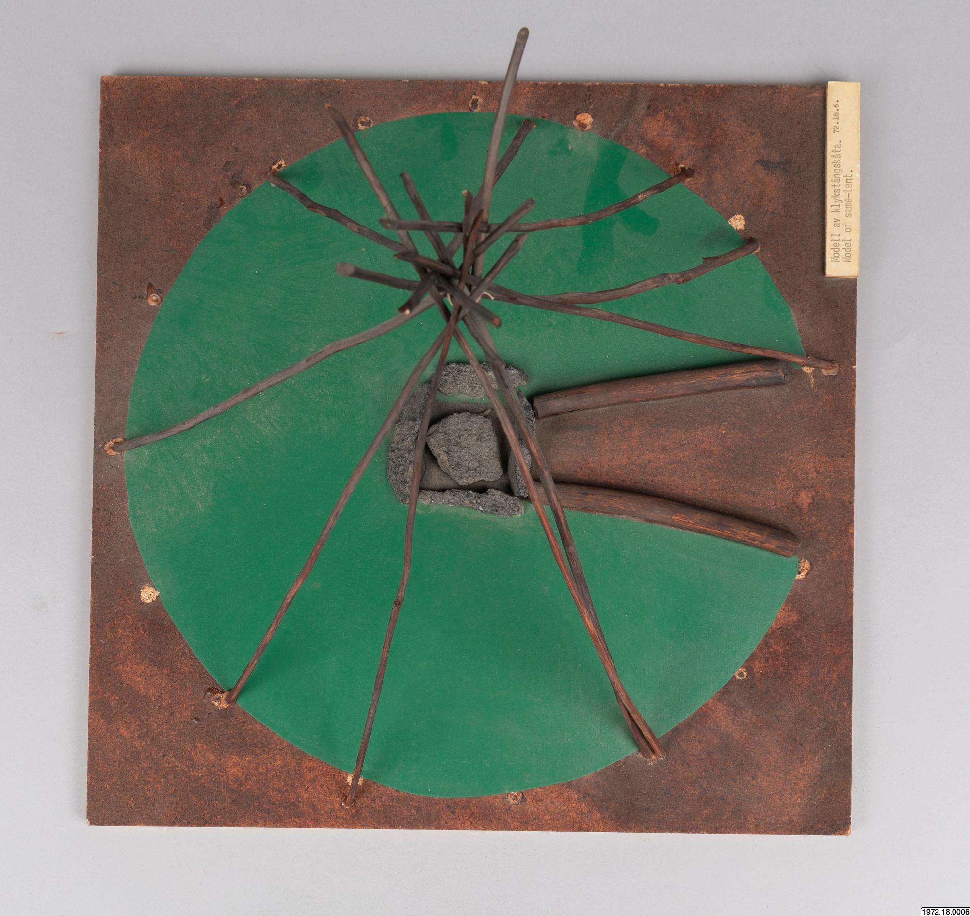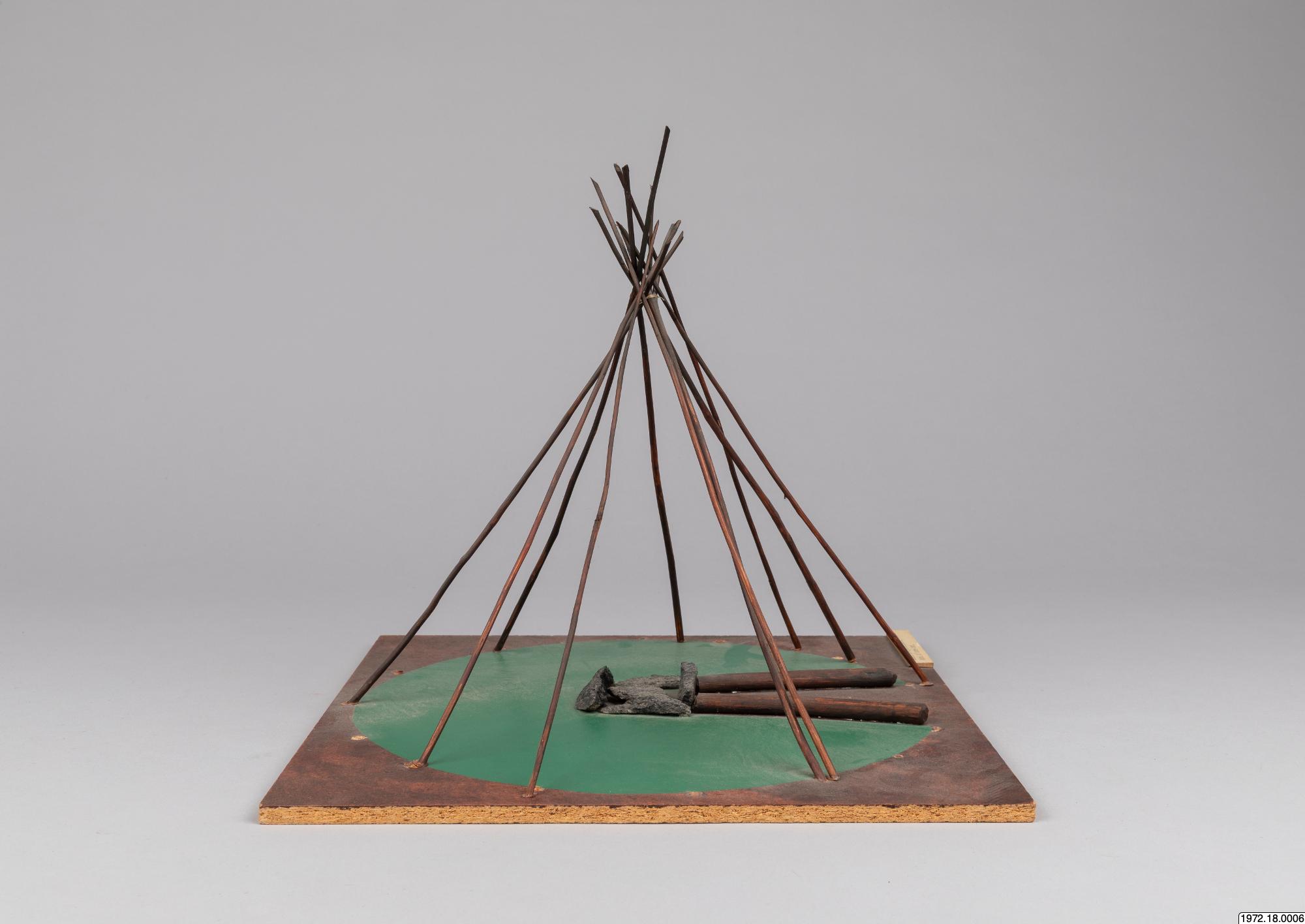 Om klykstångskåtan (1972.18.0006): Kåtan kunde se olika ut och även hållas upp av olika träkonstruktioner. Jämför modellerna 1972.18.0006-10. Relaterade sökningar: Register: [alla] FOLNAM: samer OBJTXT [innehåller]: byggnader kåta (av Madeleine Stirnimann, socialantropolog, VKM Göteborg, 2010)