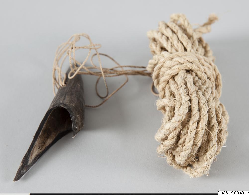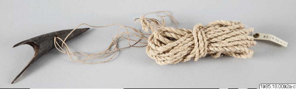 Harpunspets av kohorn, sp: fischa, MN: qaky´u´. Denna harpunspets användes tillsammans med en lång stör (ca 3 m) av t.ex. sauce. Användes endast vid jakt på den stora kattfisken zurubí. Fisken inväntas, t.ex. då den jagar sálabo, och när stjärtfenan går upp till ytan, stötes harpunspetsen in i fisken. När denna simmar iväg och linan spänns fäster hullingen i köttet och fisken kan halas in. Harpunspetsen består av följ delar: a) harpunspets av kohorn, 11cm långt, spetsat, m hulingar, perforerat, fastsatt i: b) tunt caraguatásnöre, askgrått, 44 cm, tredubbelt, i sin tur fäst i: c) tjockt caraguatásnöre, ca 4 mm tjockt, 402 cm långt.