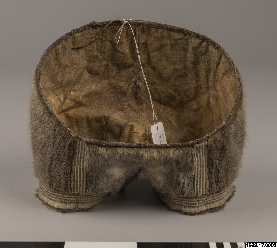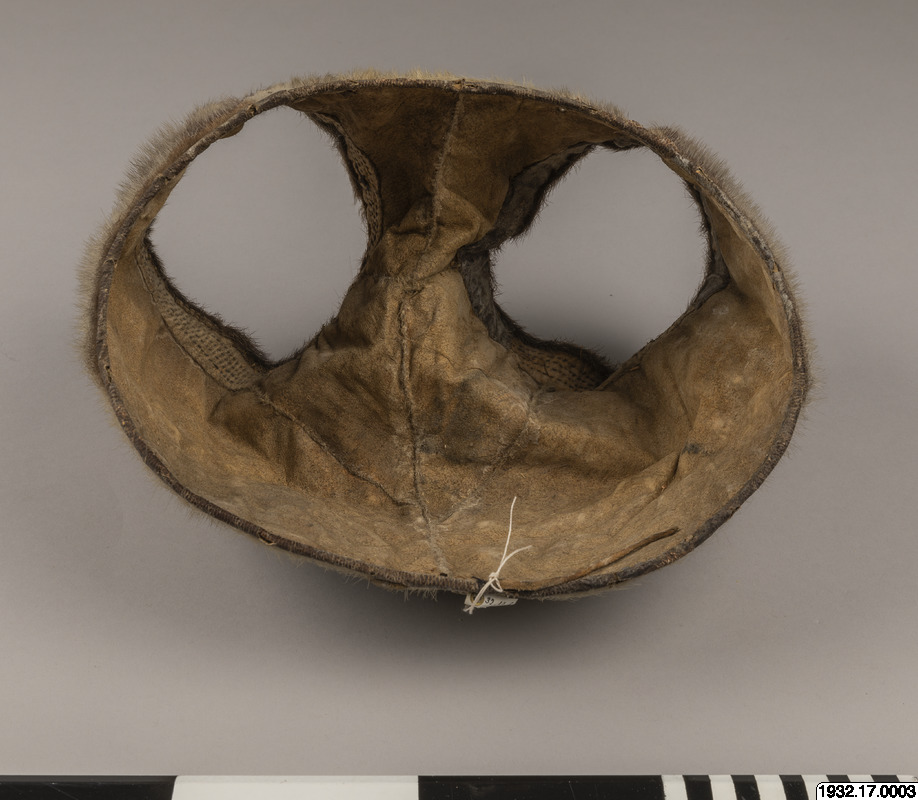 Monterades ned från gammal montering. Monteringen bestod av en träställning och tidningspapper fyllt med ett halmliknande material. Tidningspappret var från 1931 så troligen härstammade monteringen från utställning gjord på 1930-talet. För att hålla föremålens form ersattes gammal montering med syrafrittpapper 2019-07-19 (IL).