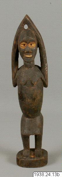 Svartmålad bärare i trä till bärstolen nr. 24.0013a. Från Bateke i Franska Kongo, Västafrika. Insamlad av missionären Efraim Andersson, Lund, och i augusti 1938 av honom överlämnad till museet. Höjd: 40 cm. Ursprung: "Köpt på utställn. i Brazzaville" Franska Kongo (Kongo-Brazzaville enl. nytt kort) Etnisk grupp: Bateke Small, black painted carrier for sedan chair no 24.0013a. From Bateke in French Congo, West Africa. Collected by the missionary Efraim Andersson, Lund, and in August 1938 he handed it over to the museum. Height: 40 cm. Origin: "Bought at exhibition in Brazzaville" French Congo (Congo-Brazzaville acc. to new card) Ethnic group: Bateke (utställningstext Horisonter - röster från ett globalt Afrika)
