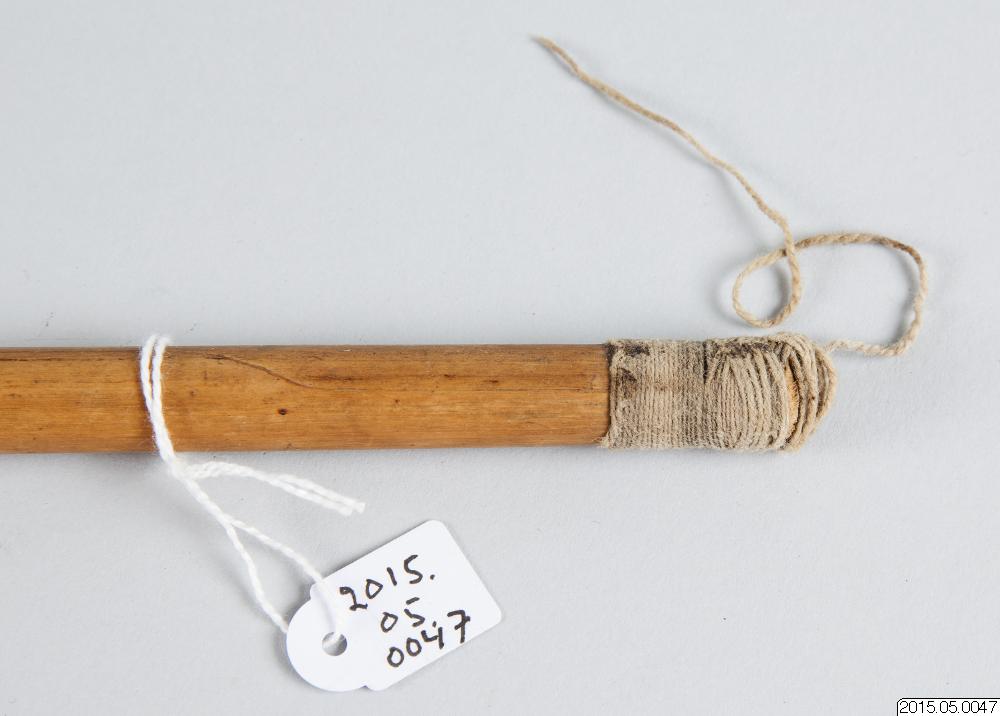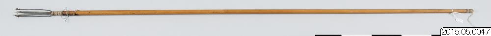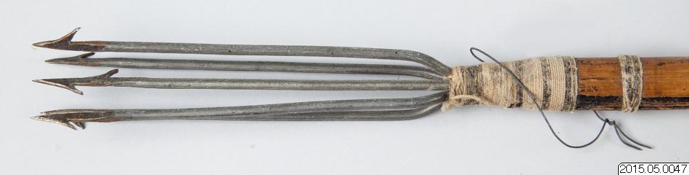 • pil med treuddig metallspets. För fiske