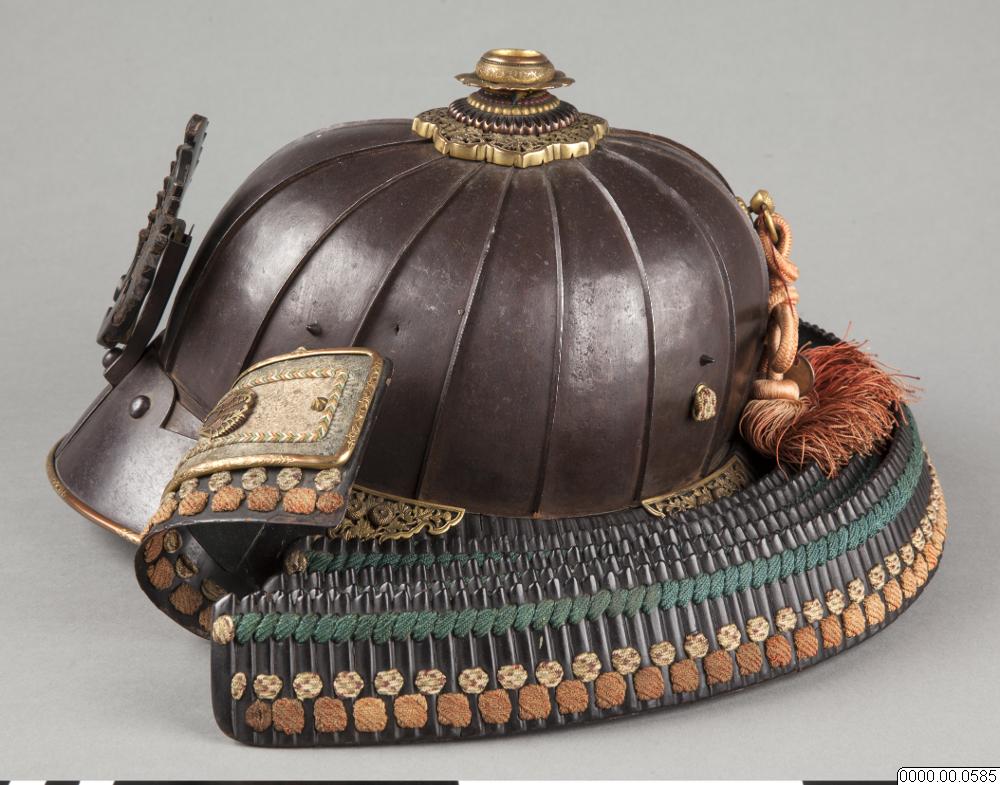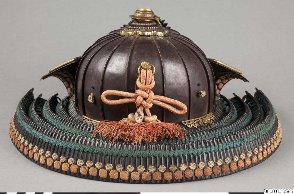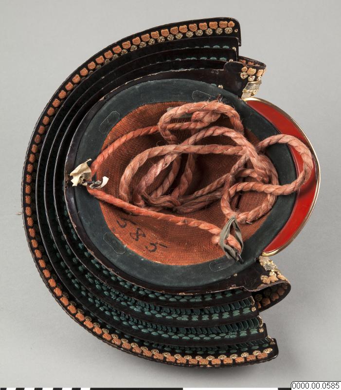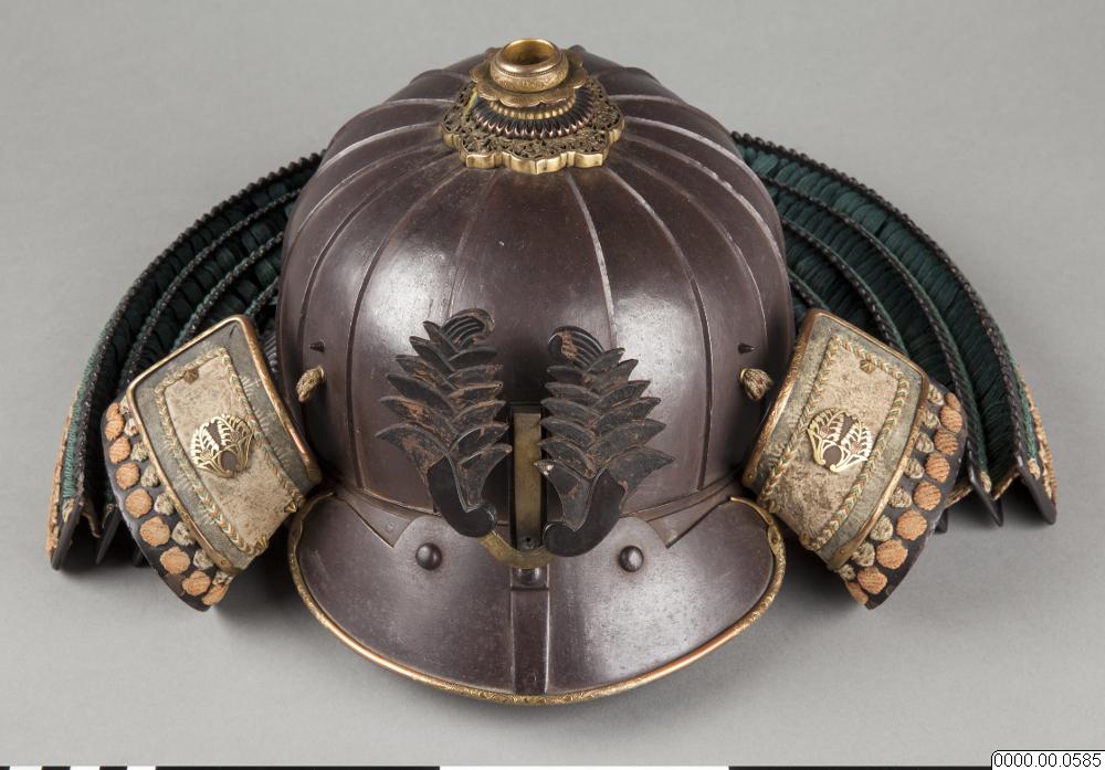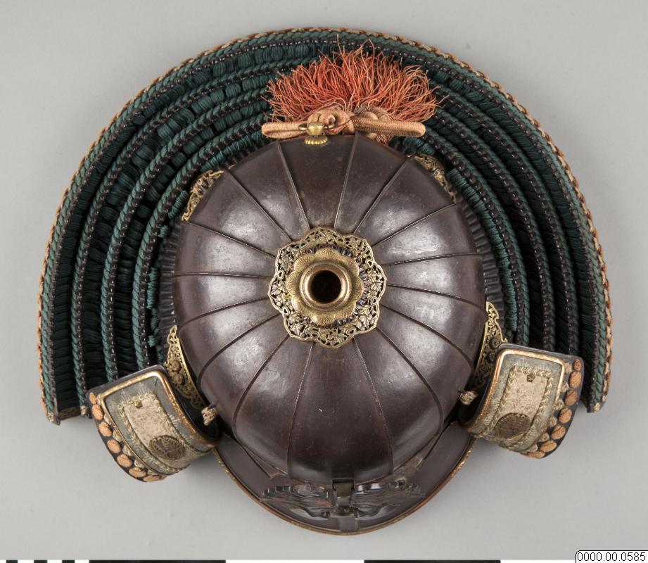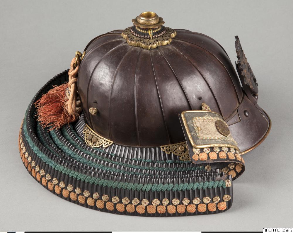 Hjälm. Skänktes redan den 12 januari 1882 av Oscar Dickson, men då att börja med ingen bestämd tillsägelse därom lämnades, så kommo sakerna ej genast att inregistreras; sedermera glömdes detta ända till den 1 juli 1884. Bredd: 43 cm. Japan: vapen