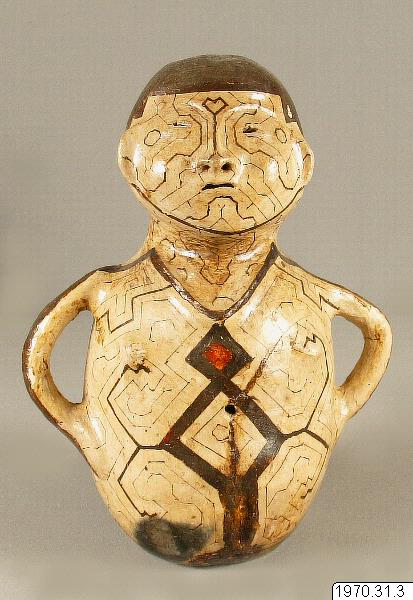 Målat och fernissat figurkärl av keramik, kvinnofigur med händerna i sidorna. Kärlet har lagats av indianerna. geometrisk dekor av samma typ som på basttyget o.d. Runt hål upptill i huvudet där håret markerats med brun svart färg. Enligt samlarna köpt från en "student" i Iquitos. Kärlets höjd 32 cm.