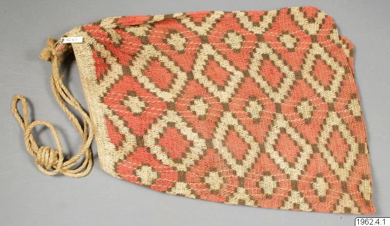 Väska av caraguata-fibrer, färgad mönstring. Föremålet insamlat under löjtnanten G.Emil Haegers expedition 1920 i argentinska Chaco. Detsamma gäller övriga nummer i denna samling. Gåva av Disponent C.Gunnar Haeger den 28/2 1962