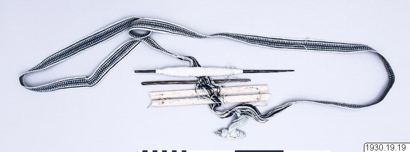 Material 2 st skälpinnar, tillverkad av en kluven pinne (säv?) 24 cm lång 1 st vändpinne för varptrådarna, 22 cm lång 1 st pinne med upplindat inslagsgarn, 32 cm lång varp bomull 2-tr S-tvin ofärg. ljus 15 tr/cm " " " blå inslag bomull 2-tr S-tvin ofärg. ljus 5 - 6 tr/cm Teknik Väv, varprips. Vävstol, varpen varpad som rundväv med öglor i båda ändar. Bandet är vävt 157 cm resten ovävd varp. Halvsolven är tillverkade av grovt ofärg. ljust bomullsgarn, dessa öglor är sammanknutna och upplindade på en pinne. Mönster Tvistränder. OBS, den inslga kniv som syns på fotot finns på magasin = kommentar på kortet.