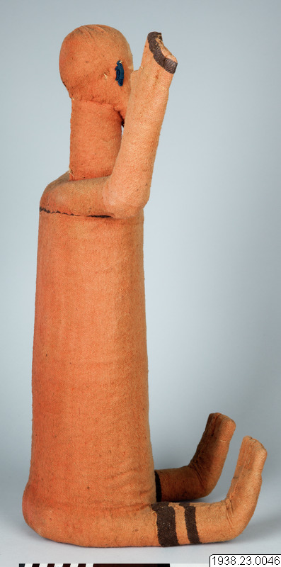 Muzidi, "förfädersidol". Av uppstoppad filt. "Ej invigd". Höjd: 75 cm. Från Babembe i Franska Kongo, Västafrika. Insamlad av missionären Efraim Andersson, Lund, och i augusti 1938 av honom överlämnad till museet.