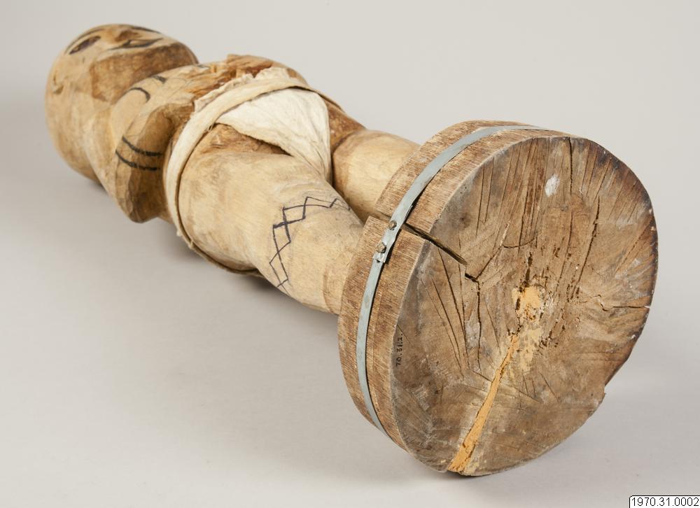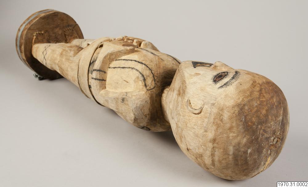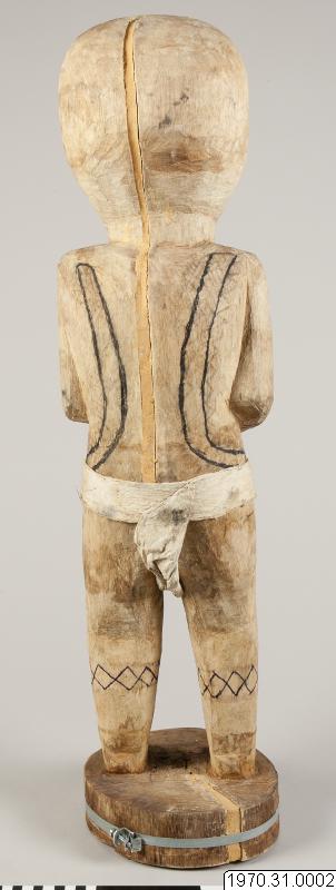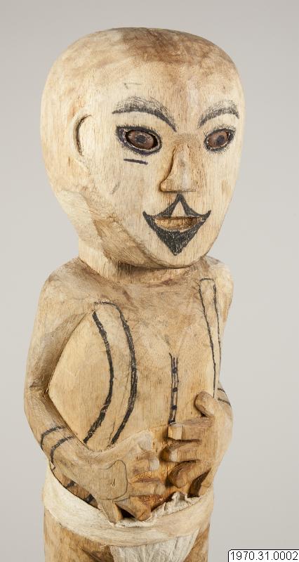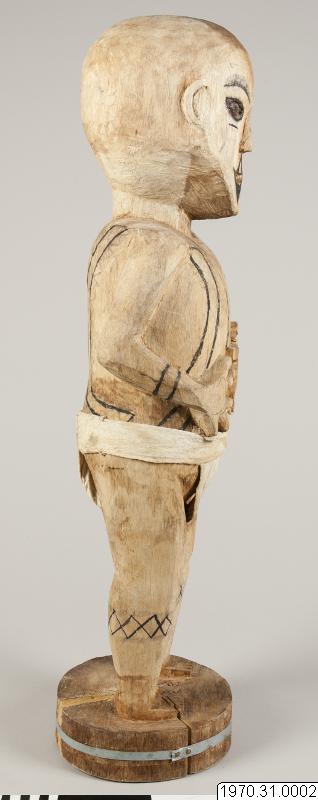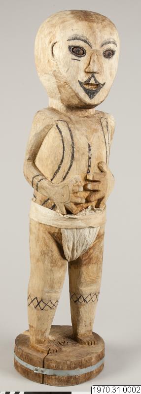 83 cm hög i balsa (?) skuren figur föreställande en man med ländkläde av bast. Står på en rund platta. Är målad med svarta linjer, har inläggningr i ögonen och markeringen av pupillen i svart, håller händerna på magen. Enligt samlarna en "memorial figure"