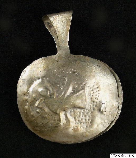 Tång av silver, med fågelmotiv. Arkeol. föremål. Depositionsföremål, sedermera inlöst i museet från E. Nordenskiölds sterbhus. Slutlikvid erlagd i december 1938. Nummer från de äldre katalogerna: 24.6.94. Se vidare generalkatalogen. nat. storl.