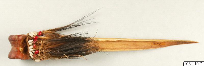 Dolk av kasuarben. Upptill prydd med tofsar av fjädrar och röda och vita frön. Längd: 38,5 cm. Insamlad av donator under en expedition till Nya Guinea.