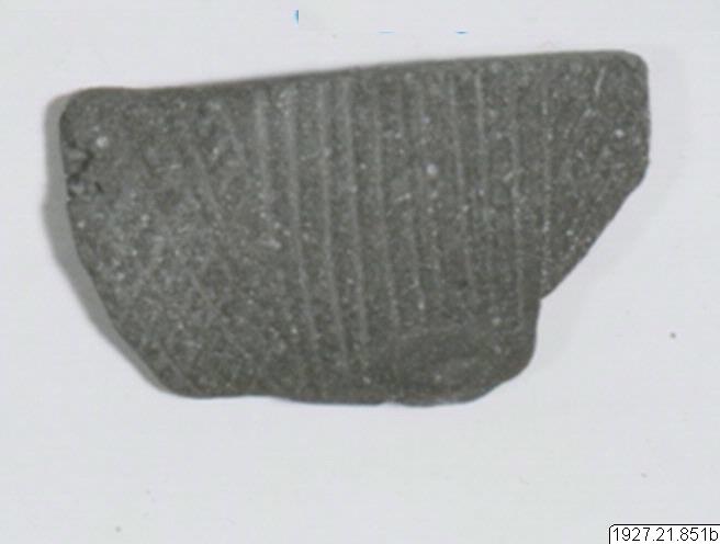 Fragment av lerkärl med ristad ornamentik och relief. Bredd: 6,5 cm.
