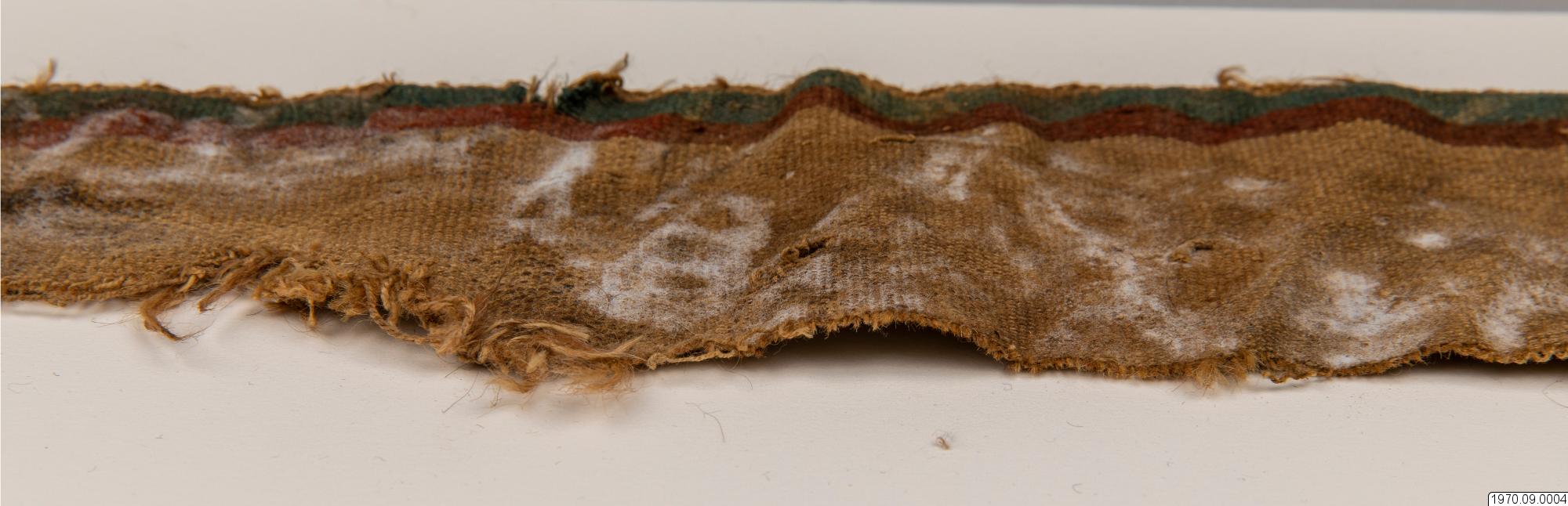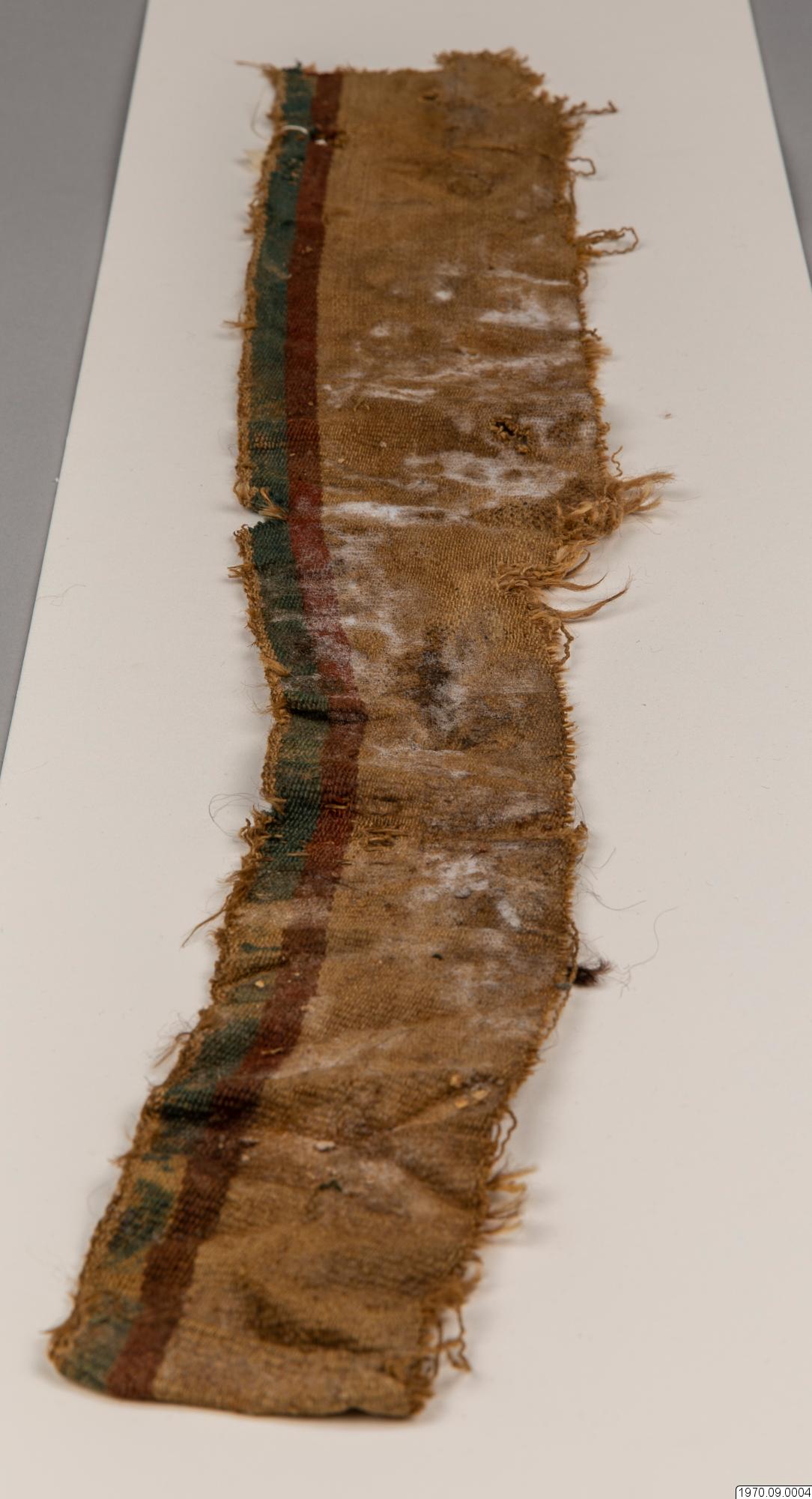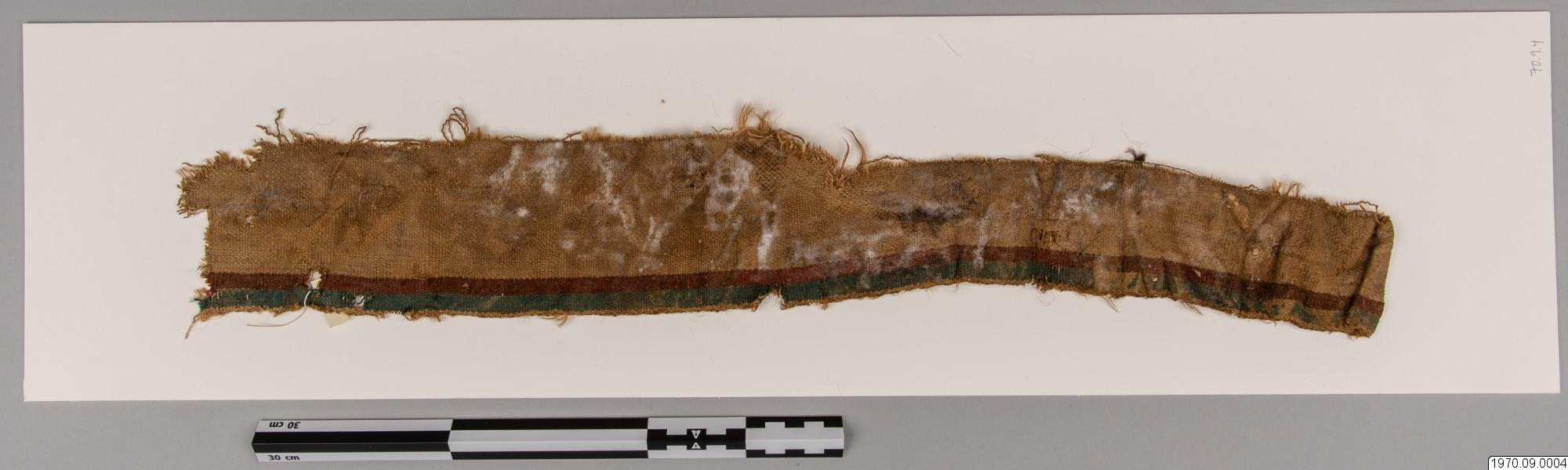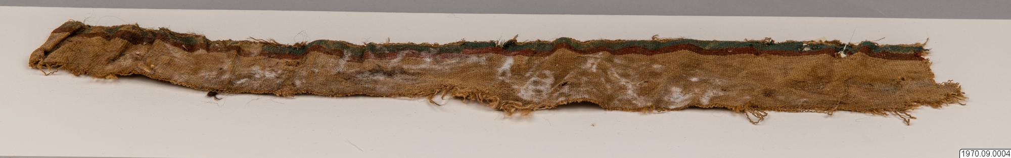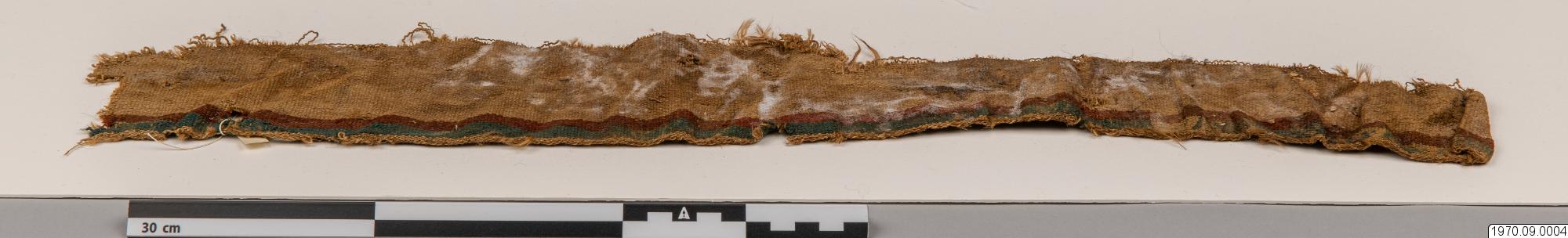 • 65 cm långt, smalt, fint, vävt tygsycke med beiga, röda och gröna bårder. Dim. 10 cm x 65 cm.