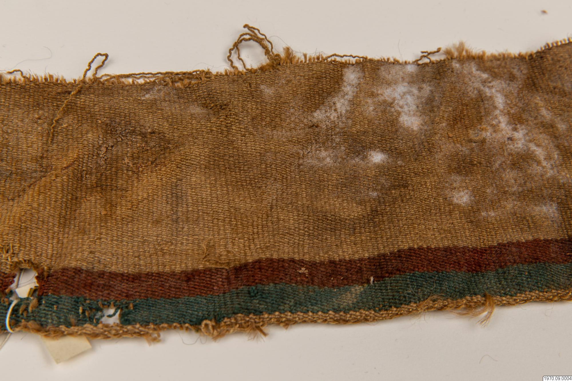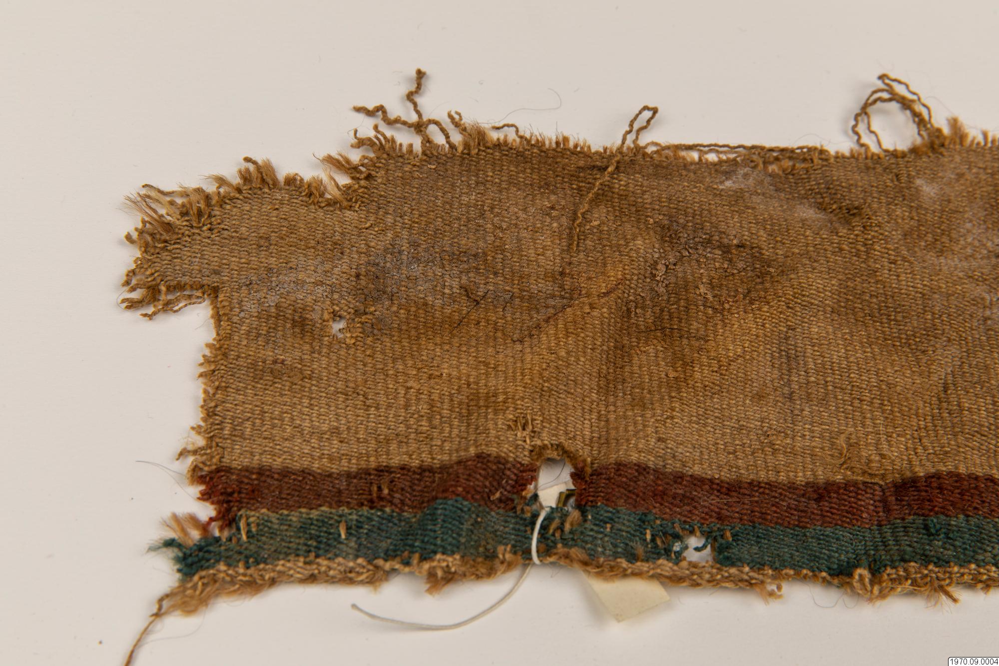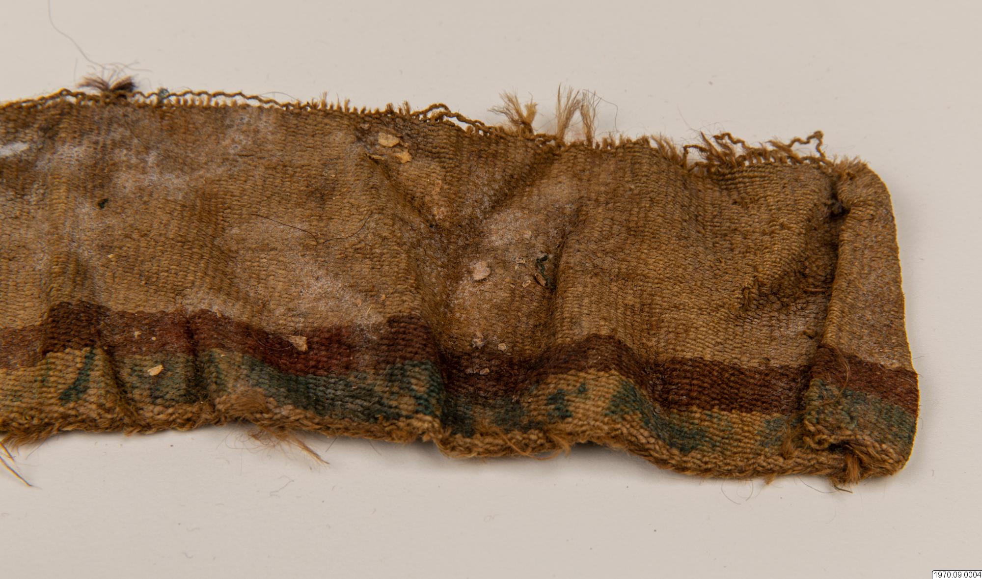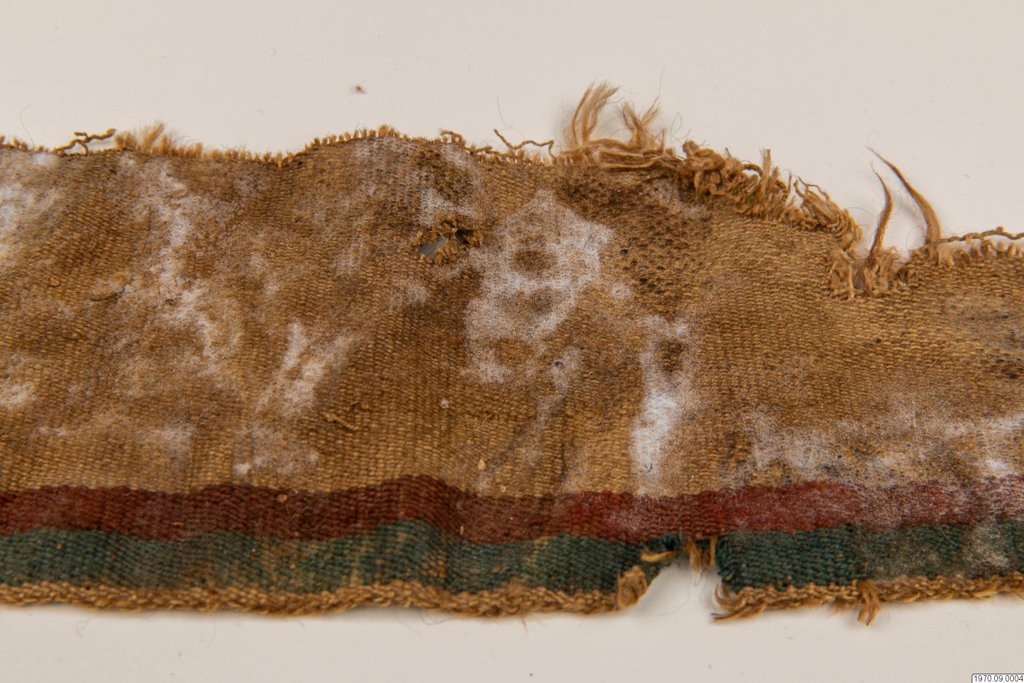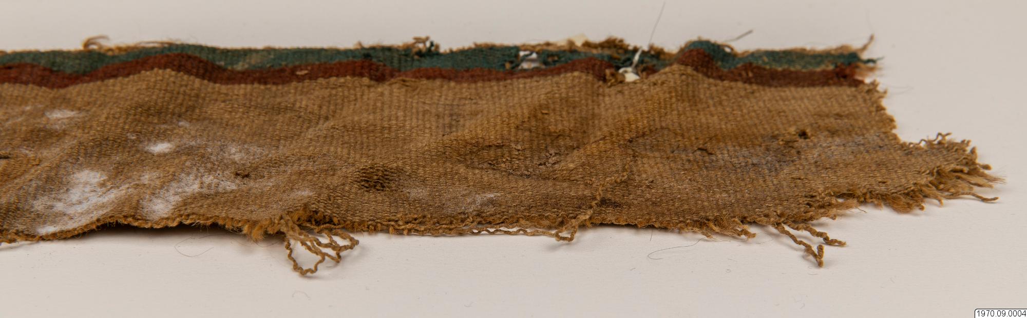 • 65 cm långt, smalt, fint, vävt tygsycke med beiga, röda och gröna bårder. Dim. 10 cm x 65 cm.