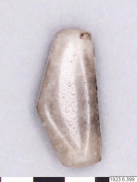 • Stensmycke, ofullbordat, troligen mitthänge eller del till halsband. Av vit glatt sten.