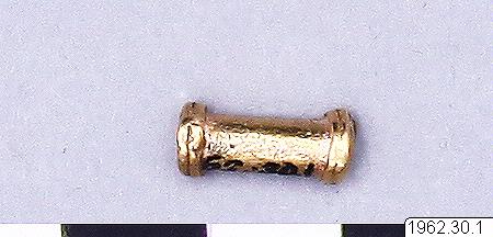 1,2 cm lång rörformig guldpärla. Köpt tillsammans med nr 2-3 i denna samling, för dollars 42:- den 8/8 1962 av Sr. Henry Grotacós Jr vid ett tillfälligt sammanträffande. Donationsmedel Hilding Svahn. Liksom nr 2 och 3 är pärlan ej jämntjock utan har vid ändarna en ringformig