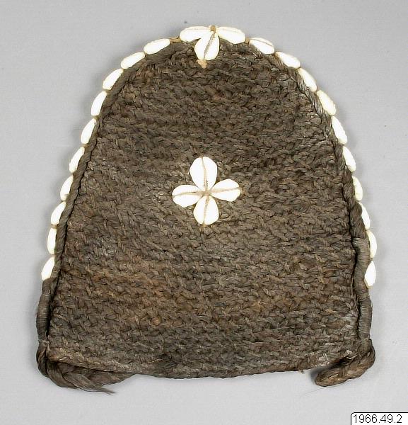 Huvudprydnad, hätta av pisangfiber? el. Urèna s.k. "Fujó" Bäres av "Bandu"-sällskapets flickor efter ceremonierna i "Bundu"-bushen, sén de kommit fram och får bli sedda av män igen. F. flätas fast på flickans huvud i håret - avlägsnas efter någon tid definitivt. Prydd med Cauri- > snäckor (Cypaee moneta) ? En äldre kvinna flätar hättan
