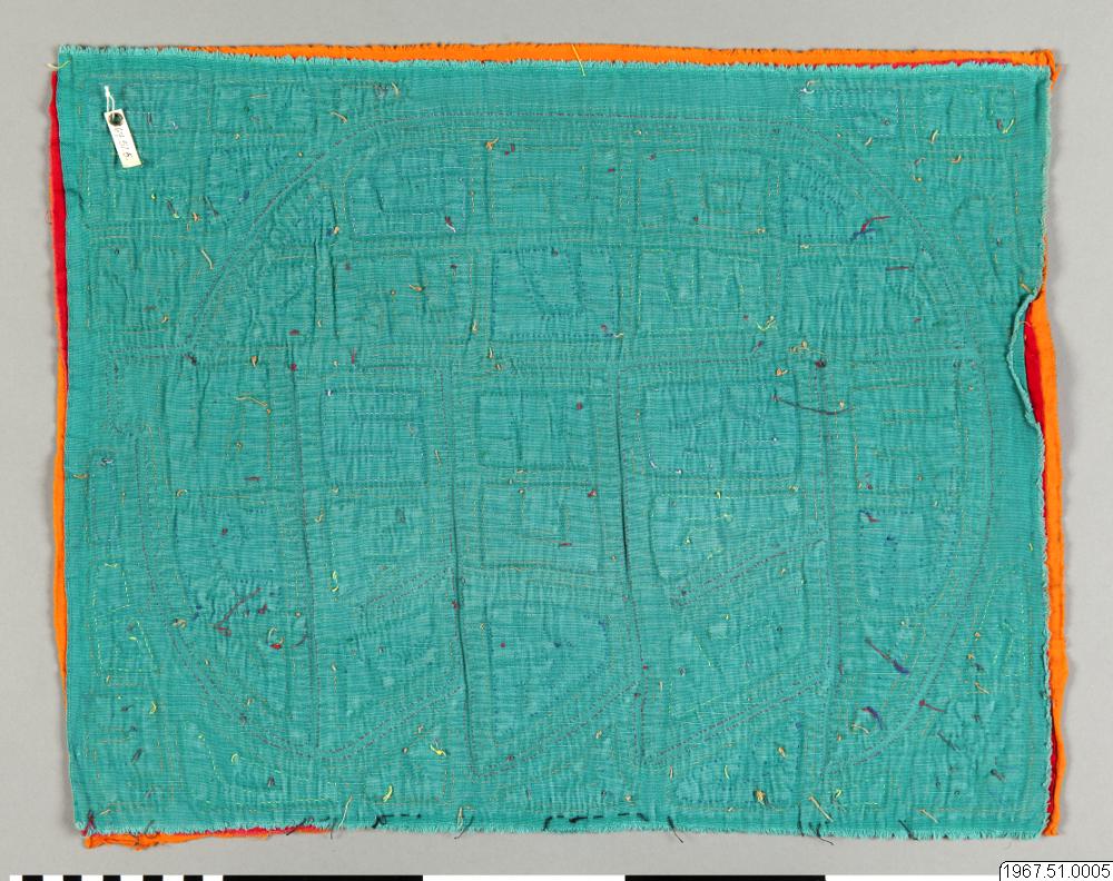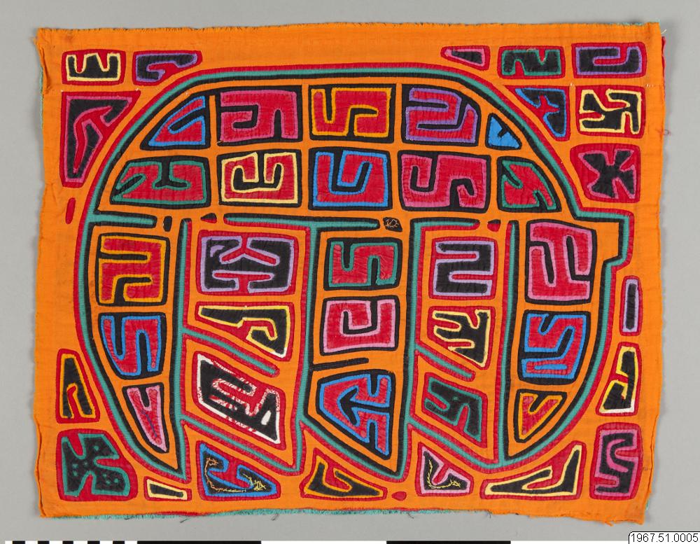 38 * 50 cm stor mola-textil (=halv kvinnoblus). Denna typ räknades av insamlaren, Miss Marion E. Miller, som en trolig "analfabetical mola" d.v.s. motivet består av ornamentalt använda mer eller mindre fritt tolkade bokstäver. Räknades i 15-dollarsklassen.