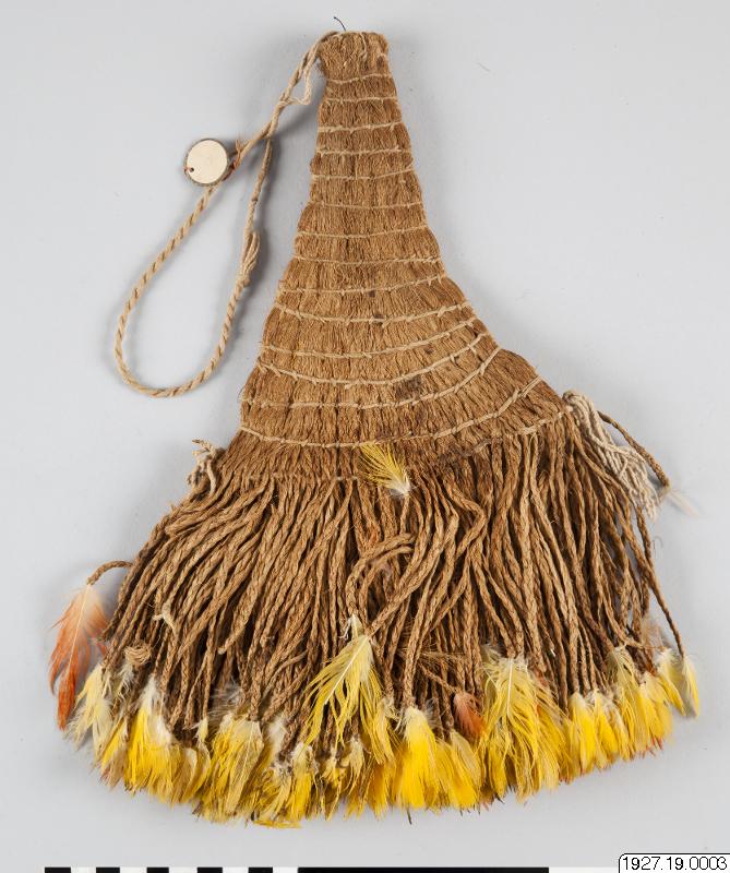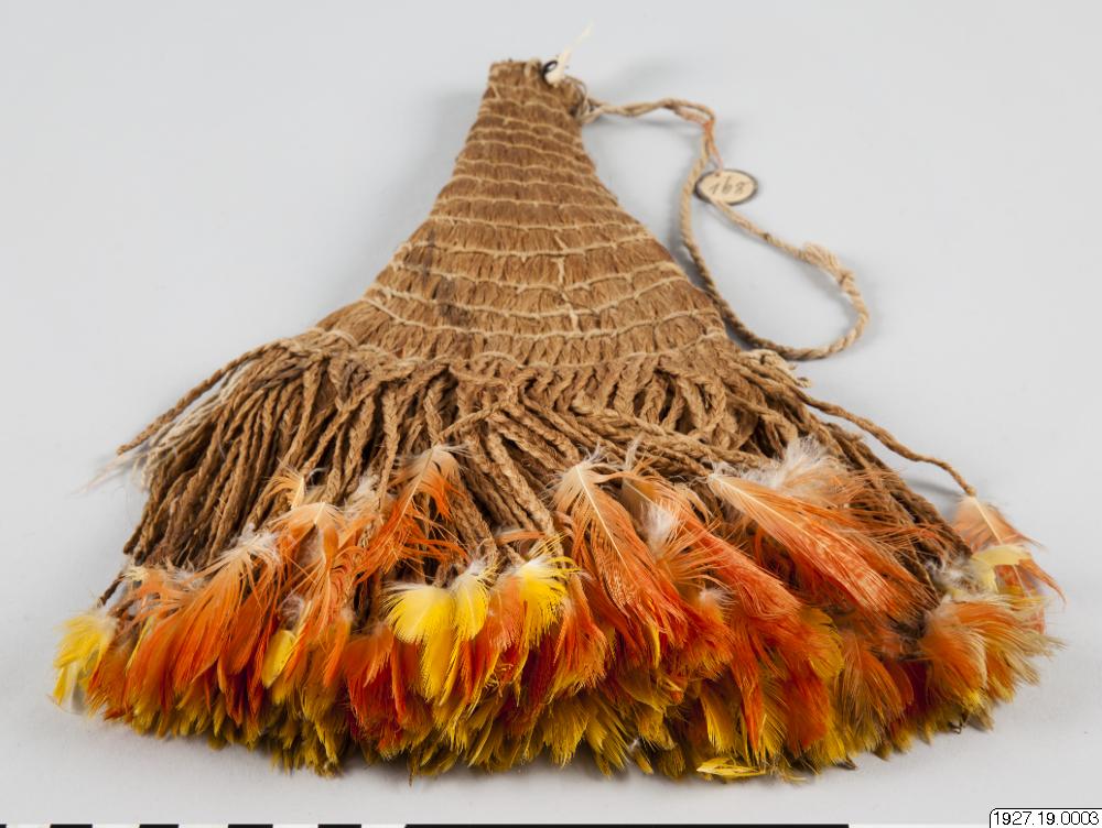 Material bastfibrer och gula fjädrar ( se fjädrar) Teknik En mängd 3-flätor av bastfibrer. På varje flätas begynnelse ände finns en gulröd fjäder, flätningen börjar med att bastfibrerna flätats om varje fjäders nedre penndel. Flätan är ca 15 - 20 cm lång. Alla dessa flätor är sammanknutna längst ner, högre upp hålls flätorena samman av en mångtrådig tråd av parallella 1-tr Z-spunna tunn...