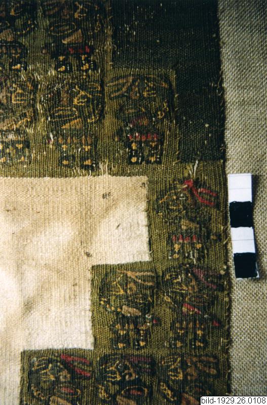 Mönster Antropomorf, geometriskt. En vävdel destår här av 3 "rutor" som i sin tur består av ett trappstegsmönster diagonalt över rutan Den ena diagonalen är enfärgad, den andra har små mänskliga figurer sedda i profil en i varje ruta.