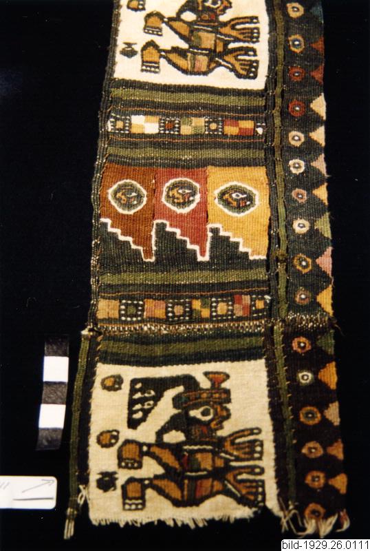 Material Varp: bomull 2-tr Z-tvin ofärg. ljus 8 tr/cm Inslag: bomull 2-tr Z-tvin ofärg. ljus ull 1- och 2-trådiga grå, gul, brun, blå, rödaktig Teknik Inslagsrips, gobelängväv delvis med långa raka slitsar. Då slitsarna är mycket långa länkas de olika delarna samman med ca 1 centimeters mellanrum. Andra är sammansydda. Inslagen är tätt packade, olika beroende på om de är 1- eller 2-trådiga garner. Olika delar är sammansydda med en grov 2-tr tråd. Fragmentet består av 2 sammansydda delar, det är två begynnelsekanter som är tätt samman kastade. Men även en lång smal del längs ena långsidan, ev en del av en annan gobelängväv som gått sänder vid en längsgående slits. Se skiss i pärm. Mönster Antropomorf: motivet består av en stiliserad mänsklig figur som flyger? Figuren har stora händer och huvudprydnad. Geometriskt: motivet består av 3 bårder brevid varandra med en trappstegsform. Varje form har i mitten en cirkel med ett stiliserat ansikte. Den långgående bården består av en bård i geometriska former och i olika färgkombinationer. Relaterad textiler GEM: 1929.26.0115, 1929.26.0133 a, b, c, 1929.26.0134, 1929.26.0145, 1929.26.0146. Schmidt 1929: 494, 495.