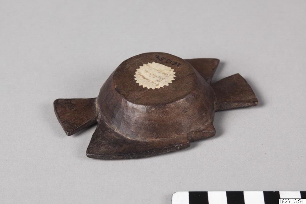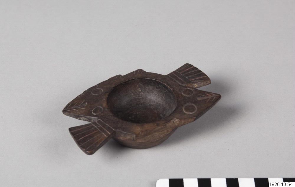 • Liten skål av trä, kanterna försedda med fiskornament.