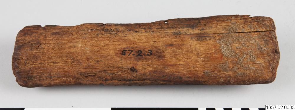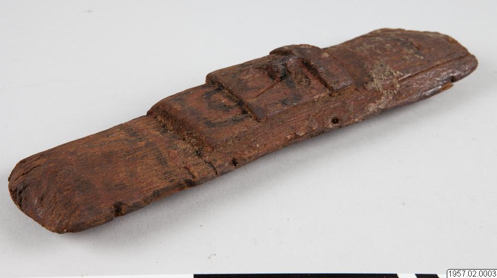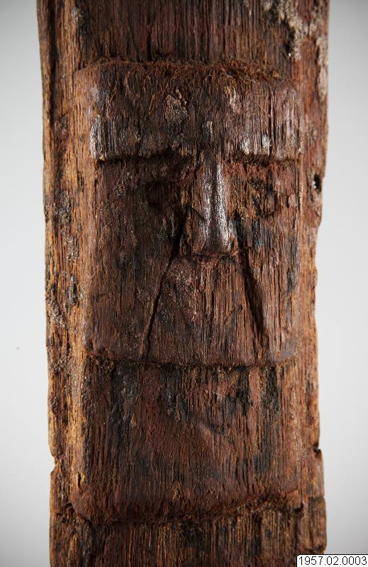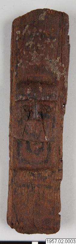 Föremål av trä, ansiktsskulptur på en bräda. Höjd 31,5 cm. Gåva av Docent A.Westholm, 1957.