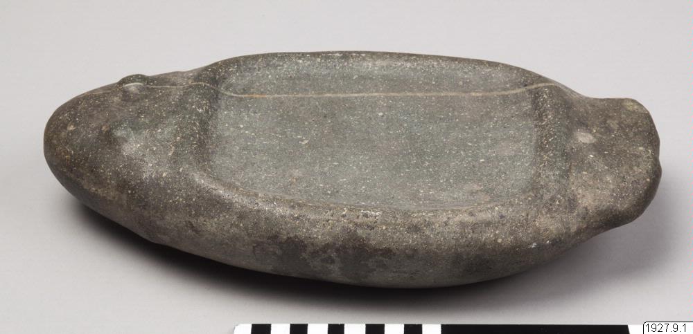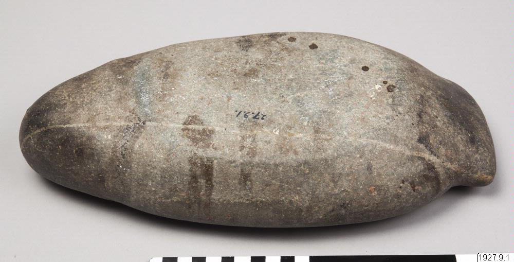 Malsten i form av en fisk eller groda. Av grön sten. Inköpt i Terapoto, Peru.