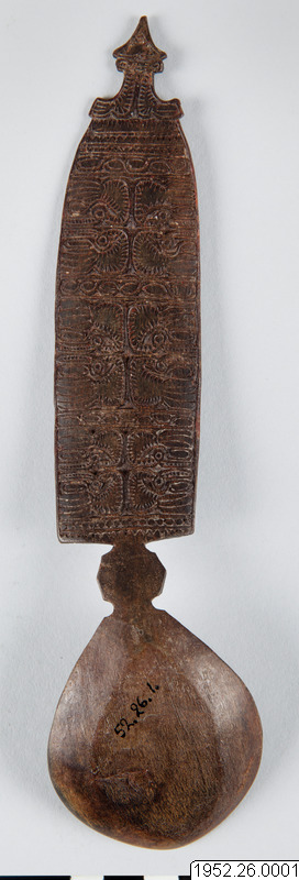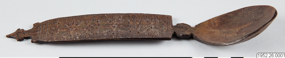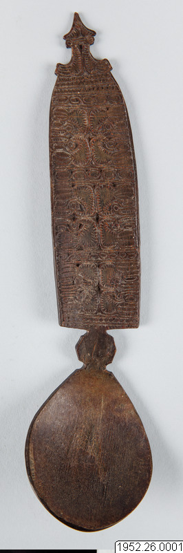 • Sked av horn. Snidat skaft med fågelmotiv (?).