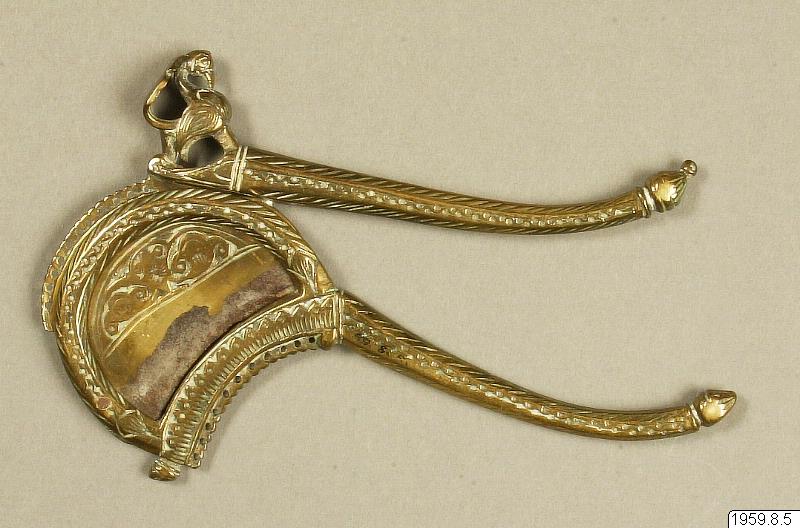 Tång för arekanötter. Av mässing, utom eggen i det skärande bladet som är av stål. Skänklarna ornerade i långrelief. På ena skänkeln en fågel. Längd: 17 cm.