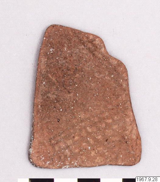 4,7 x 6,1 cm stort keramikfragment av rött gods med ristad och utsparad rutnätsornamentik. Köp från insamlaren i samband med saml. 1967.08