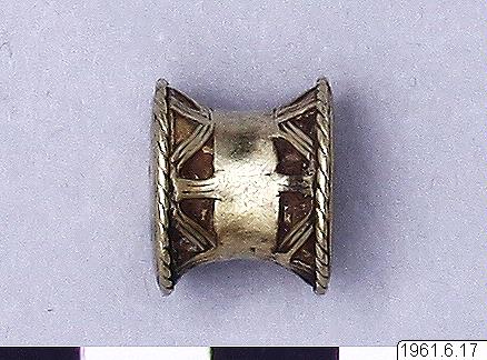 Örontrissa eller -plugg, parföremål till nr 16 i samlingen. Vikt ca 6 gr, höjd 1,2 cm, diam. 1,6 cm. Se i övrigt under nr 16. Köp från Dr. W. Behaghel, Bremen-Vegesack, 1961