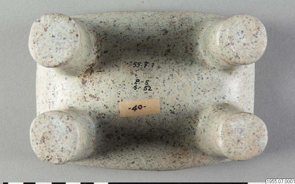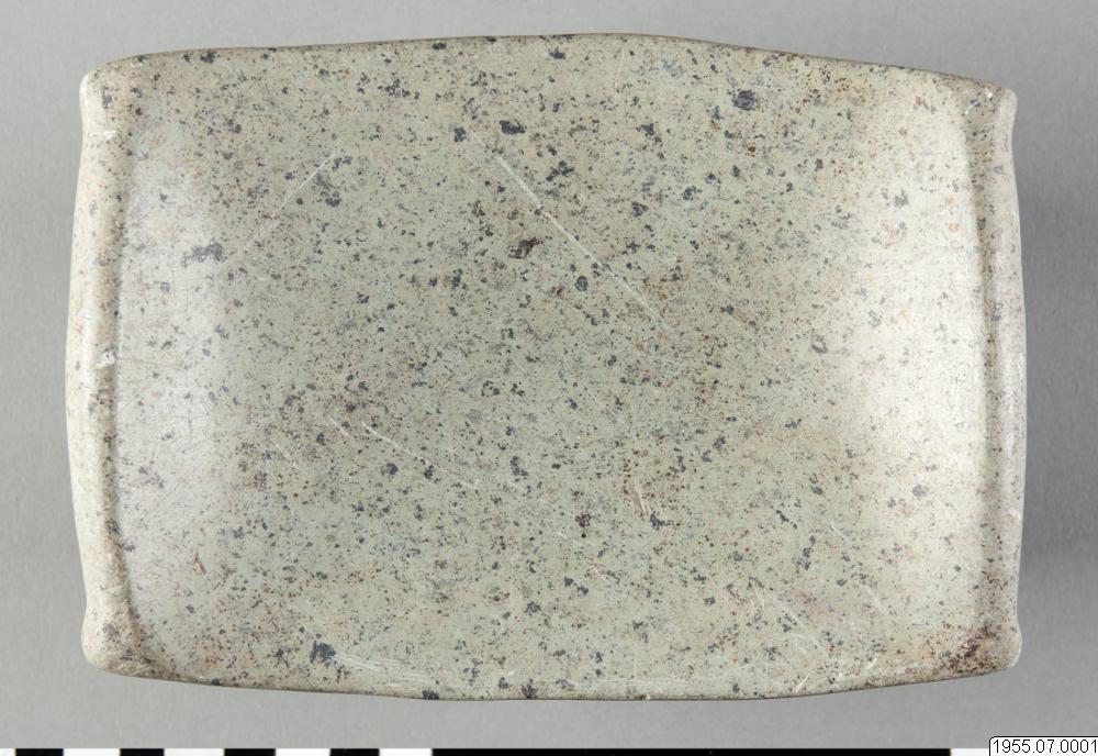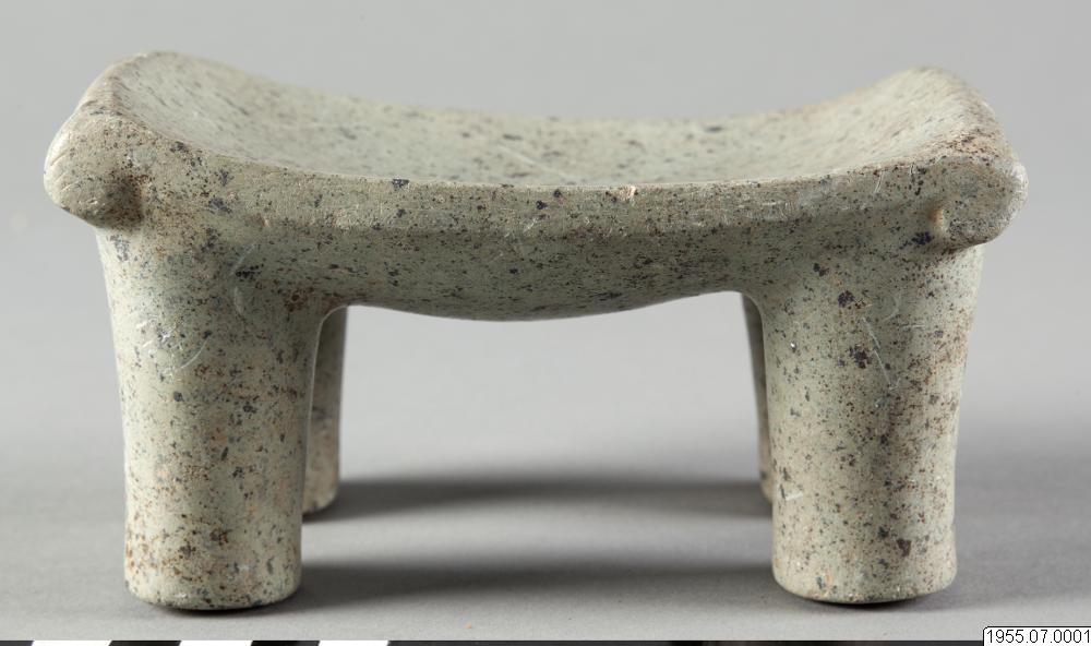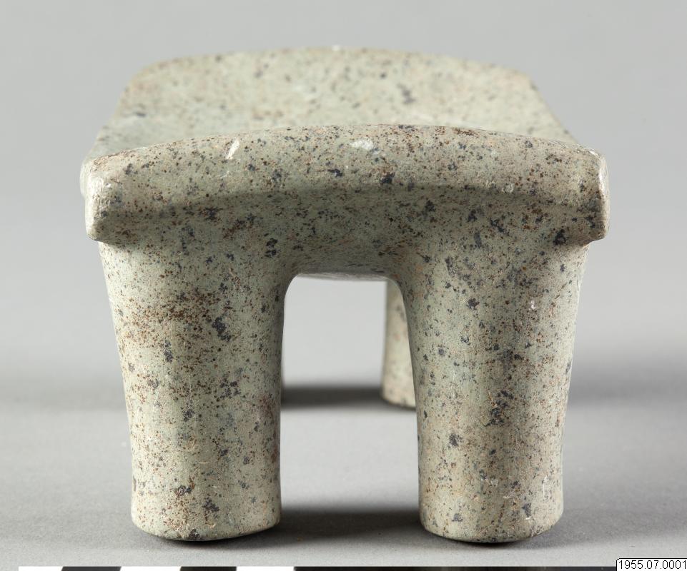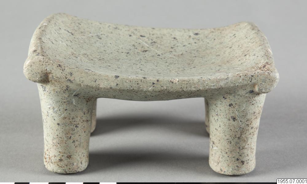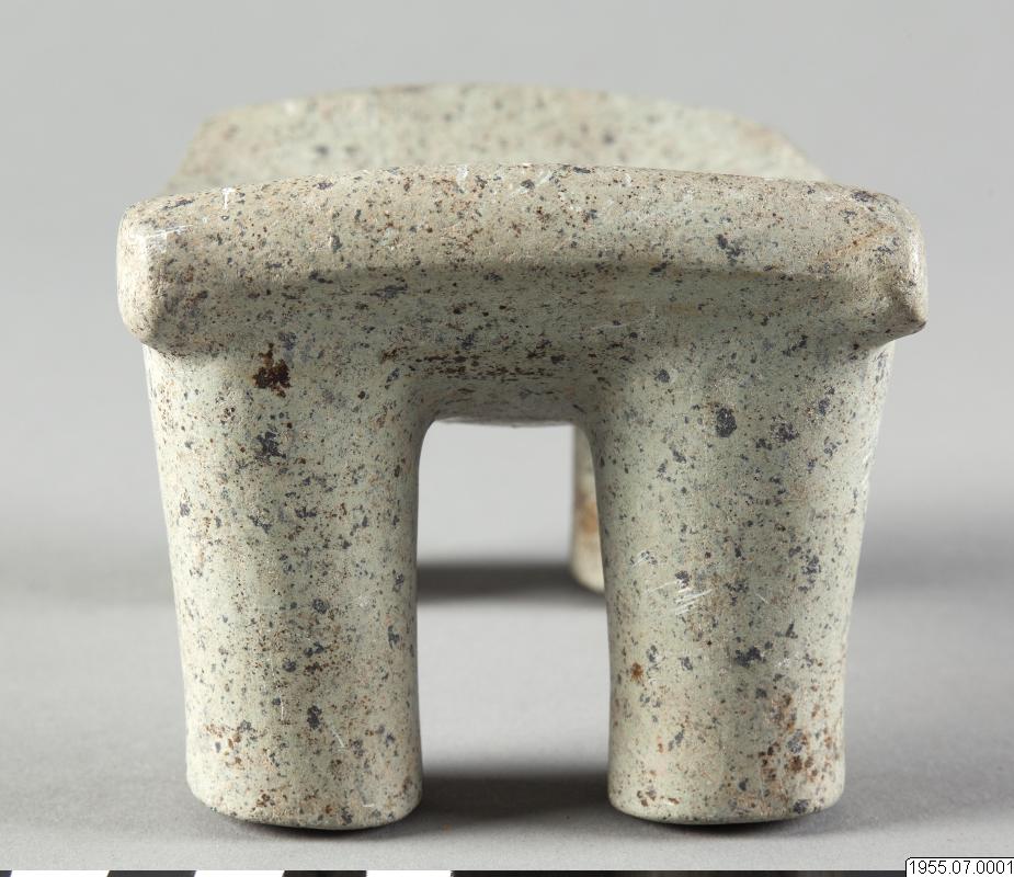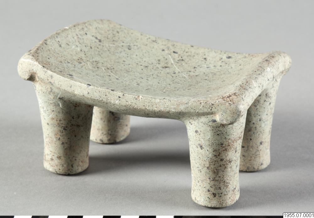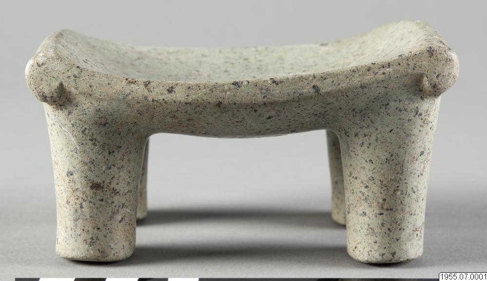 • Palliknande föremål av gråaktig bergart. Föremålet utgrävt av den colombianska arkeologen Parra. Tairona- kultur.