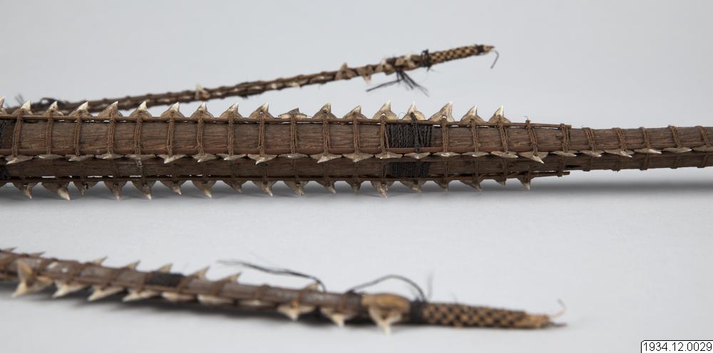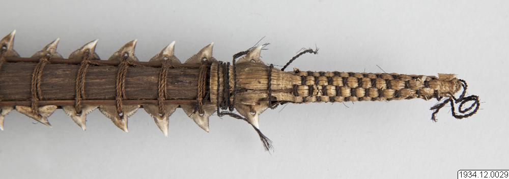 Several Micronesian traditions consider sharks to be sacred, and on many islands, sharks’ teeth were used to make swords. The sharks’ teeth were attached to the sword with threads made of coconut fibers and human hair. On every tooth, tiny holes were drilled in the exact same shape and size, and the coconut fibers were threaded through them. Sharks’ teeth swords were used in varied contexts. For example, they were used in ceremonial war games, performances intended to maintain prestige and power. They were also used in ritual duels to settle conflicts and disputes.