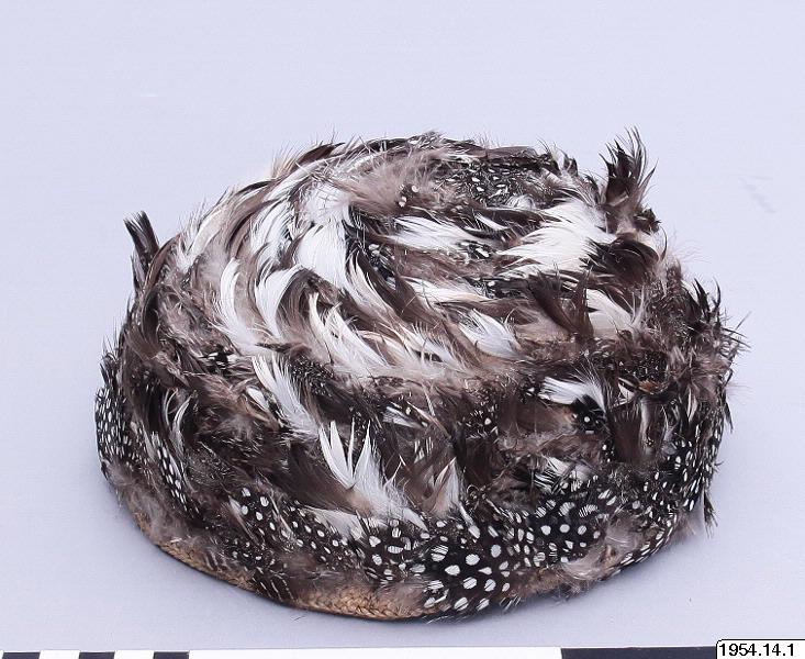 Fjädermössa, flätad med inknutna fjädrar. Köp från Fröken Elsa Beckman, Göteborg kr. 25. (katalogkort/originalbeskrivning)