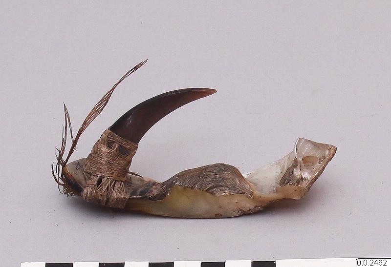 Fiskkrok av pärlemor. Trolling hook. Inköpt 1908 från Amiral Otta Lagerbergs sterbhus.