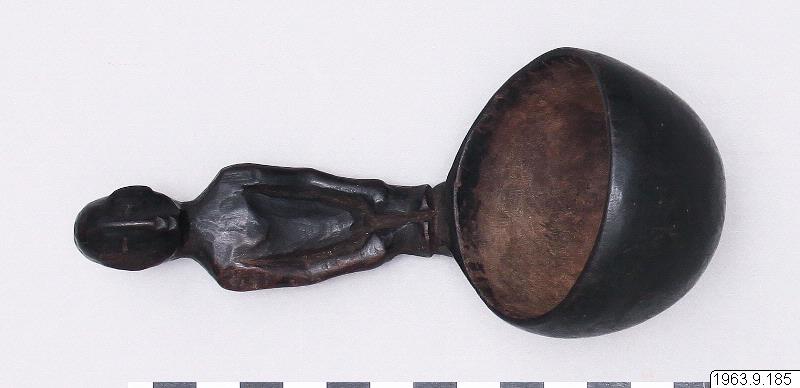 Liten träslev eller sked med skulpterat handtag. Detta har formen av en sittande människofigur. Benen är här inte krökta så att knäen kommer upp i brösthöjd utan partiet men benen är krympt. Händerna ligger mot benen. Neråtsträckta armar. Skåra markerar ryggraden. Längd: 14 cm. Fägning mörkbrunt. Kallas pauq.