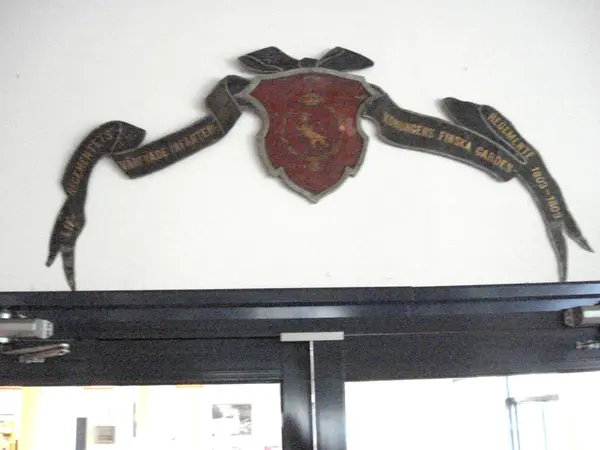 • Sköld målad på plåt som visar Göta Livgardes traditionsarv från olika förband i Sverige och Finland.