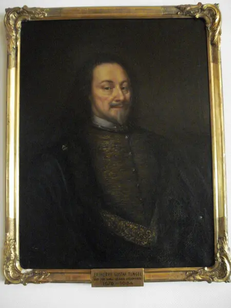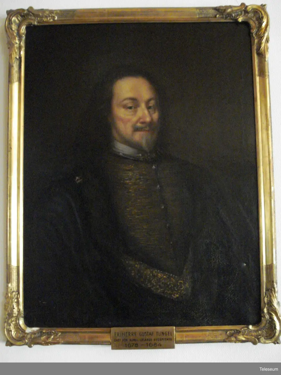 • Olja på duk, förgylld ram. Porträtt föreställande Friherre Gustaf Tungel, Chef för Kungl Upplands Regemente 1678-1674.