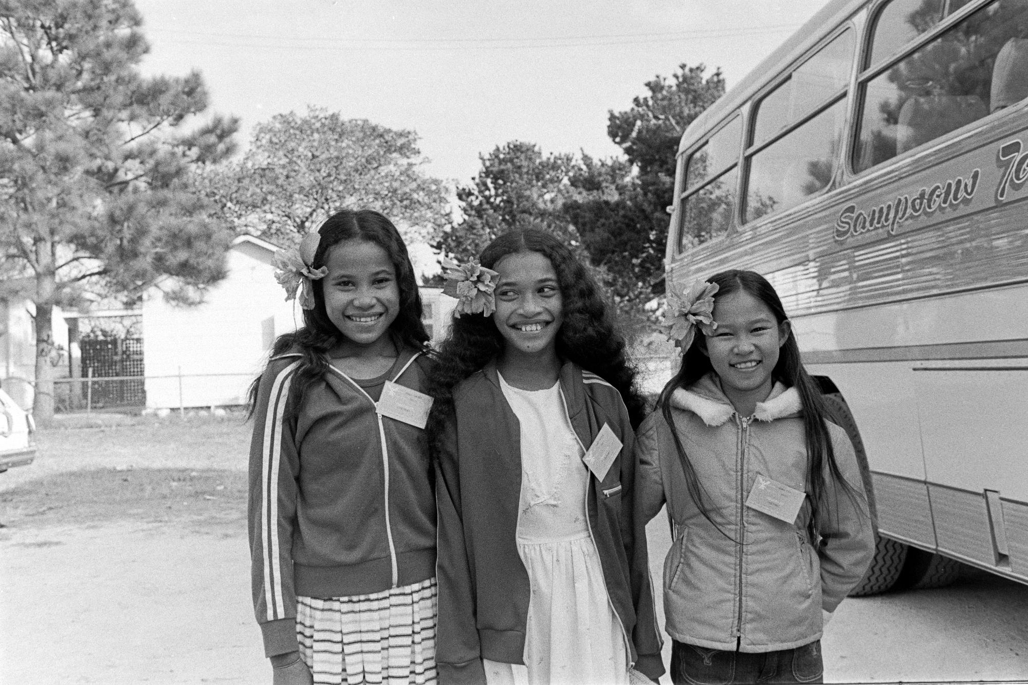 • Tre flickor står på rad bredvid en buss. De alla ler, de har varsin blomsterhåraccessoar och namnskylt.