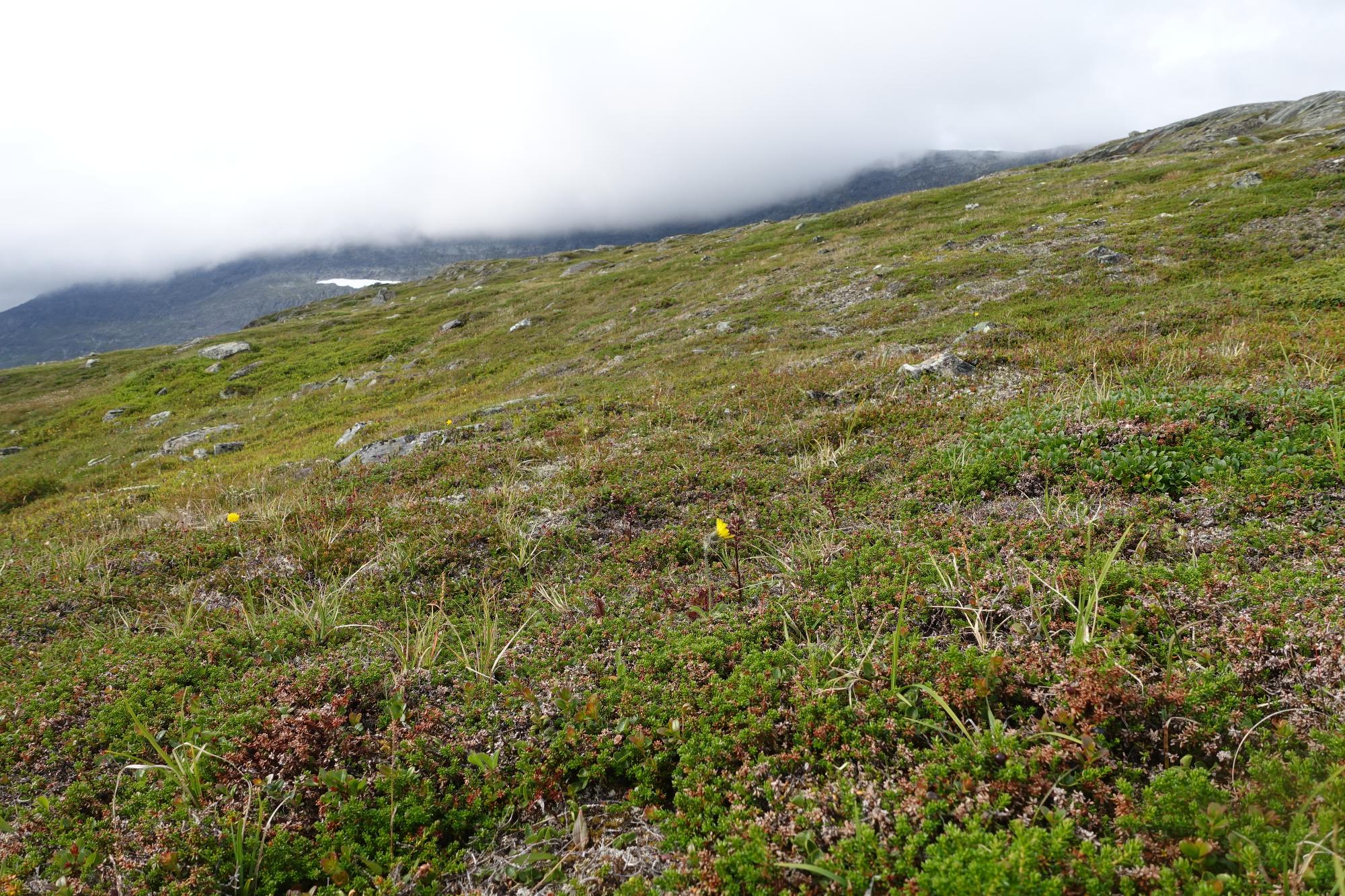 • Biotopbild av fjällhed med kråkbär, styvstarr, nätvide och fjällfibblor. Även svartfibblor växer på lokalen. Bilden tagen mot norr över Goahtnjunjes västända med Fierro i bakgrunden.