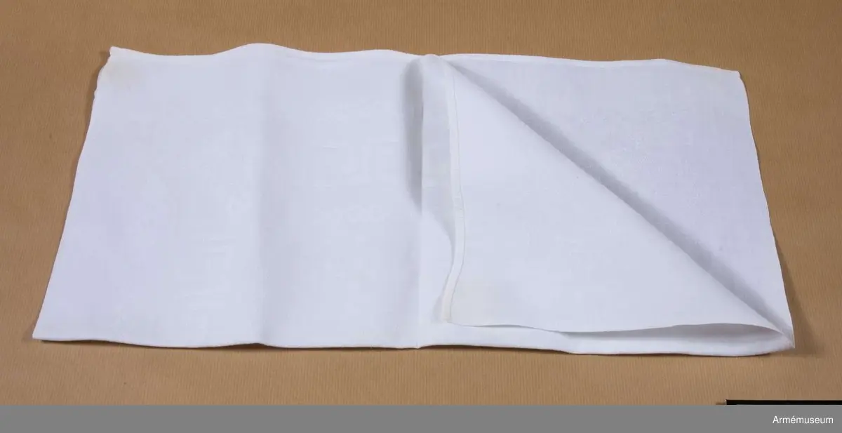 En specialvävd servett till officermässen I 14. Damastvävd med prickar i mitten och i hörnen "Hälsingebocken".