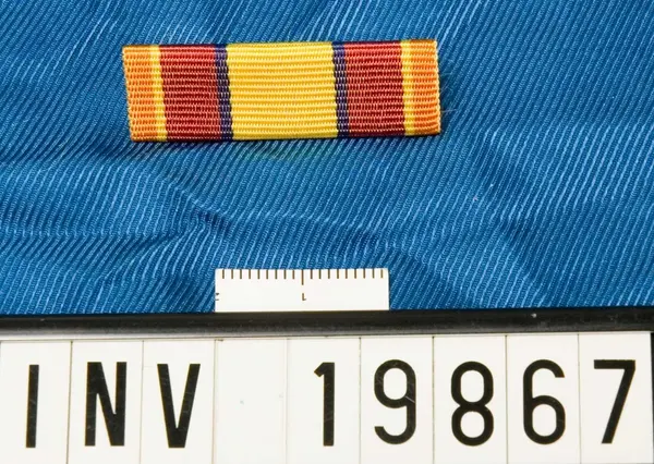 Bandet är mörkrött med en bred gul rand på mitten på vardera sidan åtföljd av ett blått streck samt med orange kanter åtföljda av ett gult streck. Släpspännet förvaras i ask tillsammans med en medalj och en miniatyrmedalj.