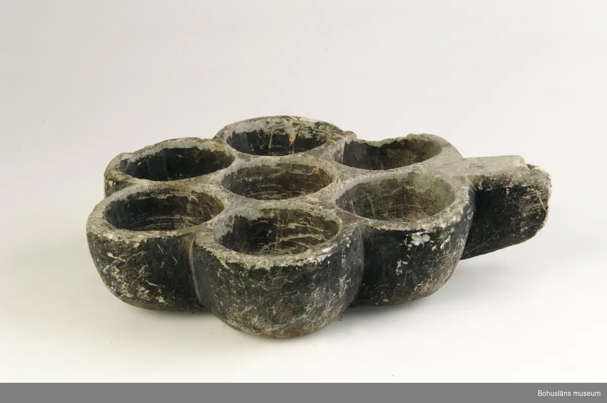 Munkpannor användes för att grädda små jästa bullar av vetedeg Ordet munkpanna känt i skrift sedan 1670-talet. Ur Svenska Akademiens ordbok: Munk; liten uppöst bulle av vetedeg, kokad i flottyr l. bakad i munkpanna; äv. om visst slags potatisplättar, i ssgn RAGG-MUNK. . jfr BERLINER-, BOVETE-, DRÖM-, FINGERBORGS-, GRÄDD-, KRIKONS-, MANDEL-, POTATIS-, PÖS-, RAGG-, ÄGG-, ÄPPEL-MUNK. Täljsten är ett material som använts i årtusenden. Täljsten är bra på flera sätt; den är lätt att forma, den tar snabbt åt sig värme och behåller värmen länge. För att forma stenen kan man tälja med ett redskap med vass egg, precis som namnet säger. Man kan också hugga med yxa, såga och hacka, slipa och borra. Så blir stenen till kyrkliga skulpturer, dopfuntar, byggnadsdelar eller sländtrissor och knappar. Bergarten är inte bara mjuk utan också seg och sammanhängande. Den innehåller klorit och minst 50 % talk. Ju mer talk, desto mjukare sten. När man tar på den känns den litet oljig. Egenskaperna i förhållande till värme gör att täljsten använts för gjutformar, strykjärn, bakplåtar och grytor. Fortfarande är den vanlig i braskaminer. Täljstenen är så gott som osmältbar, den är eldfast, och kan flyttas direkt mellan stark värme och kyla. Man kan steka på den utan fett. Den tål olika ämnen och kemikalier. Pulvriserad täljsten har använts som magringsmedel i keramikdeglar vid smältning av metall i höga temperaturer. I Bohusläns berggrund börjar ett stråk av täljsten som löper från Ytterby och Jörlanda, upp genom Dalsland och vidare till Östfold i Norge. Flera gamla täljstensbrott har hittats. Täljsten heter fedtsten (på danska), kleberstein (på norska), soapstone (på engelska) och speckstein (på tyska). Litteratur: Aarsrud, Christian: Föremål av täljsten. Att upptäcka ett landskap, Dalsland genom kulturhistorien. Vänersborgs museums skriftserie nr 2, Uddevalla 2004, s. 205-214. Alin, Johan: Ett täljstensbrott vid Lunnevik i Skaftö socken. Vikarvets årsbok 1931. Hallbäck, Sven-Axel: Medeltida dopfuntar i Bohuslän, Vänersborg 1961. Pehr Kalms Västgöta och Bohuslänska resa förrättad år 1742, redigerad av Krantz, Claes, Wahlström & Widstrands förlag, Stockholm 1960, s. 142 och 153. Wahlö, Claes: Om grytor. Kulturen årsbok 1985, s. 103 - 104.