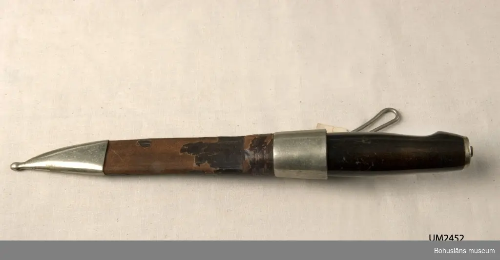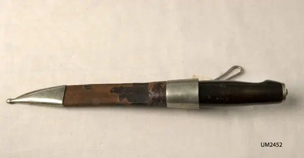 Kniv med svartlackerat träskaft med nickeldetaljer. Föremålet har brukats. Slida av skinn/läder och gjutna nickeldelar. Skinndelen svårt nerbruten av s.k. red rot; troligen orsakat av felaktig garvningsprocess. Slidan har en upphängningsanordning med rejäl hake med låsmöjlighet. Både kniv och slida är märkta med tillverkarens namn. Tillverkaren/smeden Gustaf Johan Berg, Eskilstuna, levde mellan å...