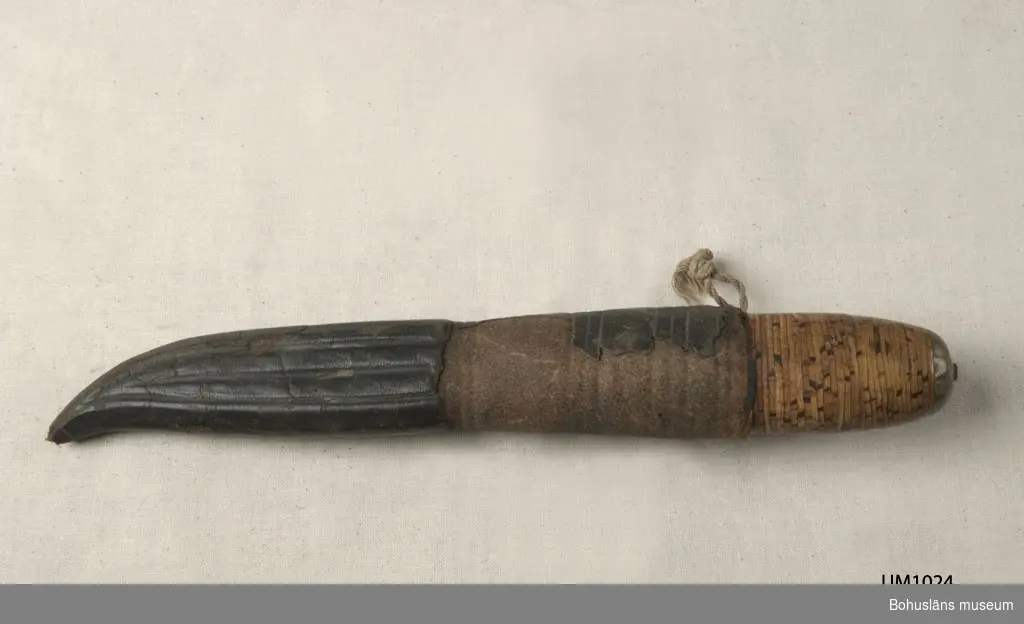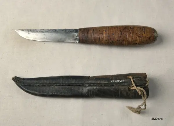 • Knivens skaft är gjort av näver som packats tätt kring tången. Slida av svartfärgat läder med inpressad dekor; skador på narvsidans ytskikt. Upphängningsögla saknas.