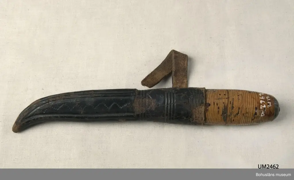 Knivens skaft är gjort av näver som packats tätt kring tången. Slida av svartfärgat läder med inpressad dekor. Upphängningsögla av läder, skadad. I bruksskick. Ur handskrivna katalogen 1957-1958: Slidkniv m. näverskaft o läderslida Knivens l.: 19,6 cm, varav knivbladets l. utgör 9,4 cm Ngtr rostig. Brunt skaft. b) Svart läderslida m. ögla. L.: 16,6 cm. Nött. Öglan trasig. Lappkatalog: 29