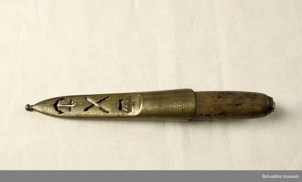 Kniv med svartlackerat träskaft. Merparten av lackerade ytan har slitits bort. Mässingsavslutning mot knivbladet; troligen har det funnits en liknande del i skaftets ända men den saknas. Kniven har brukats. Slida av mässing, gjuten med genombruten dekor och präglat mönster. Mönsterformerna består av en krona, koslagda vapen, ett ankare samt en avlång dekorativ form. Upphängningsögla med rester av ett skinnband. "No 13" stämplat på slidans överkants baksida. Både kniv och slida är märkta med tillverkarens namn. Tillverkaren/smeden Gustaf Johan Berg, Eskilstuna, levde mellan åren 1843 - 1878. Ur handskrivna katalogen 1957-1958: Slidkniv m. mässingslida Kniven a) L. 18,7 cm; träskaft, svart, färgen avflagnad. Slidan b) L. 14,2; krona, korsade knivar och ett ankare, delvis i genombr. arbete. Hel.